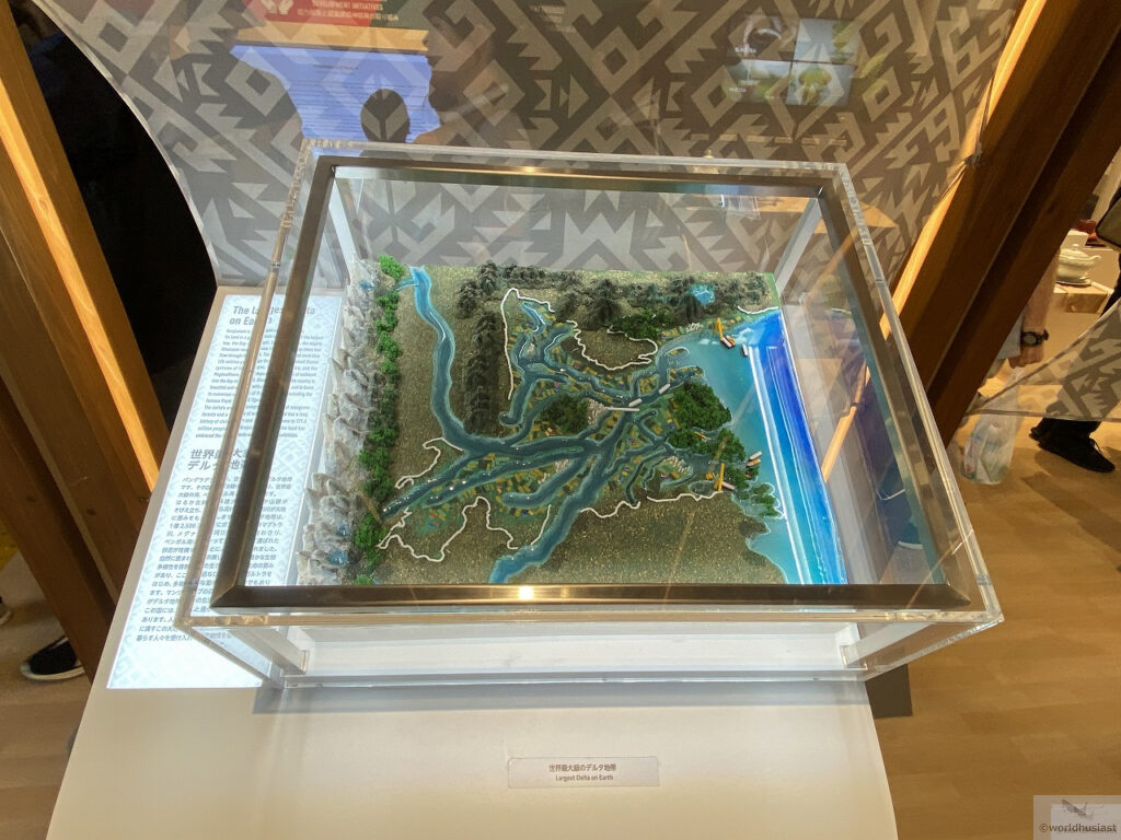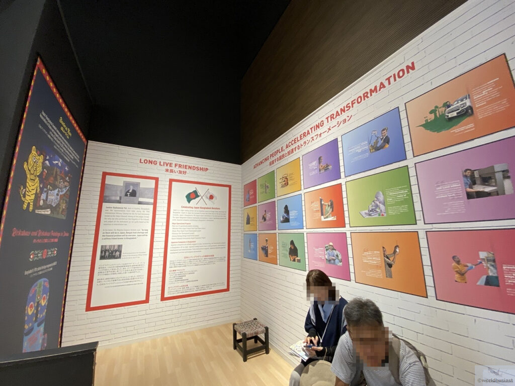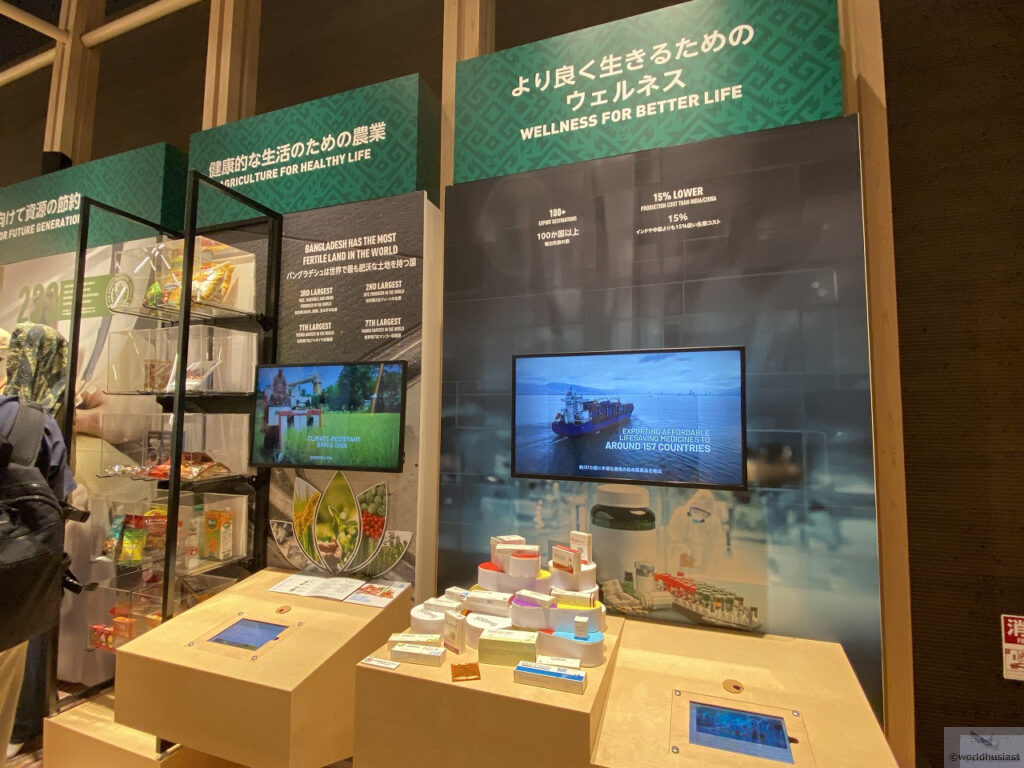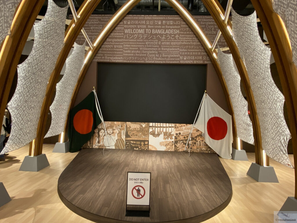 アーチの左側を通って出口に向かいます。ここでは農業のほか、バングラデシュは人件費が超絶安いためさまざまな衣類を縫製していることも触れられていました。ユニク□とかバングラ製のがありますが、あの超格安はバングラの人のおかげでもあり、洋服を選ぶときに思いを馳せてみるのもいいですね。