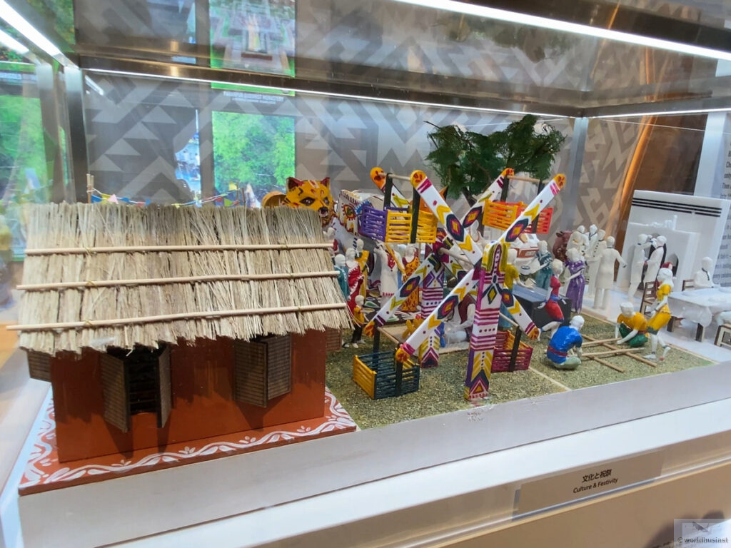 まずアーチの中を進んでいくと、バングラデシュのジオラマや、モスリン(織物)、産業発展、文化と祝祭などのミニチュア展示がありました。ベンガルトラはユネスコ無形文化遺産マンガル・ショブハジャトラと思われます。