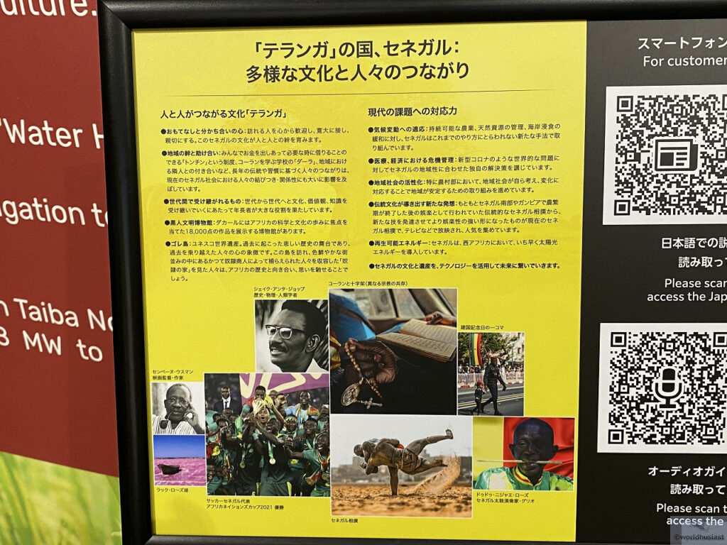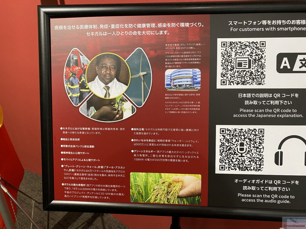・・・と思っていたら、小さいですが日本語のパネルもありました!セネガルは非常に遠いですが、西アフリカではかなり都会で現地では出張日本人もいましたが、多くの日本人には知られていないのが残念です。サッカーと松屋のマフェくらいでしょうか。