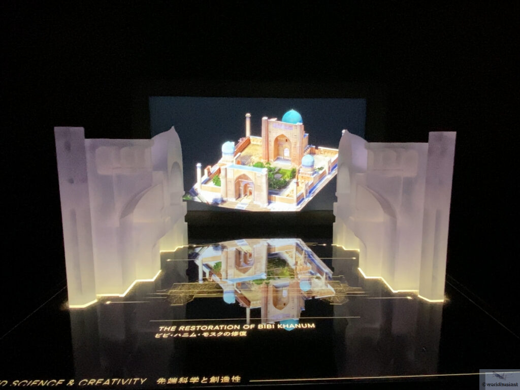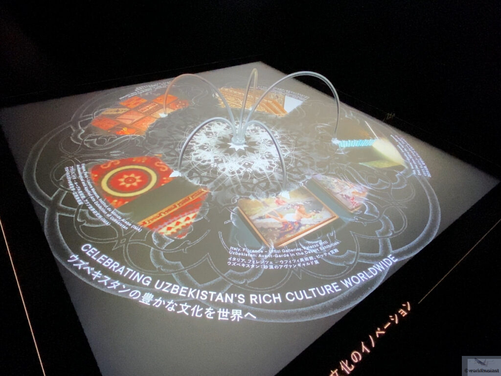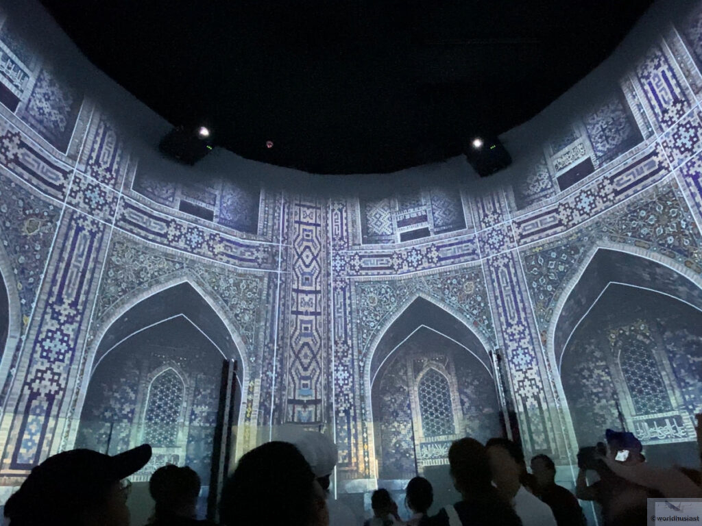 中に入ると真っ暗。中央に円形の部屋があって、その外周にウズベキスタンに関する展示があり、係員の説明に沿って基本的にツアー形式で見ていきます。展示物はややわかりにくく、各自が見ていくと時間がかかりそうなので、さらっとした説明でサクサク進めたのはよかったです。