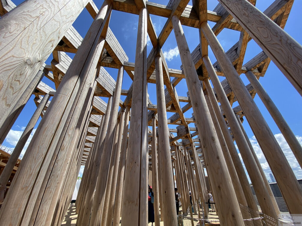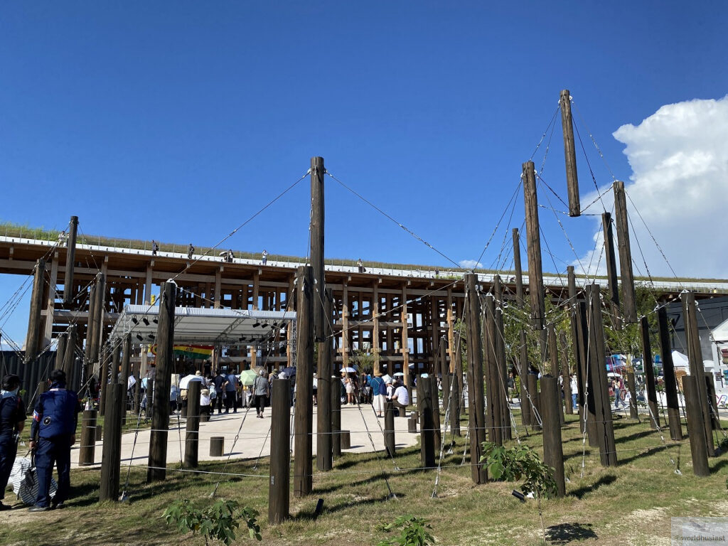 その後は2階へ。外からも見える331本の国産杉の木があります。当初、大屋根リングは丸太案があったそうですが却下。鉄骨を想定していたウズベキスタン館は工事が間に合わないため、丸太を流用することで無事完成、ということだそうです(東洋木材新聞 2025/3/5)。