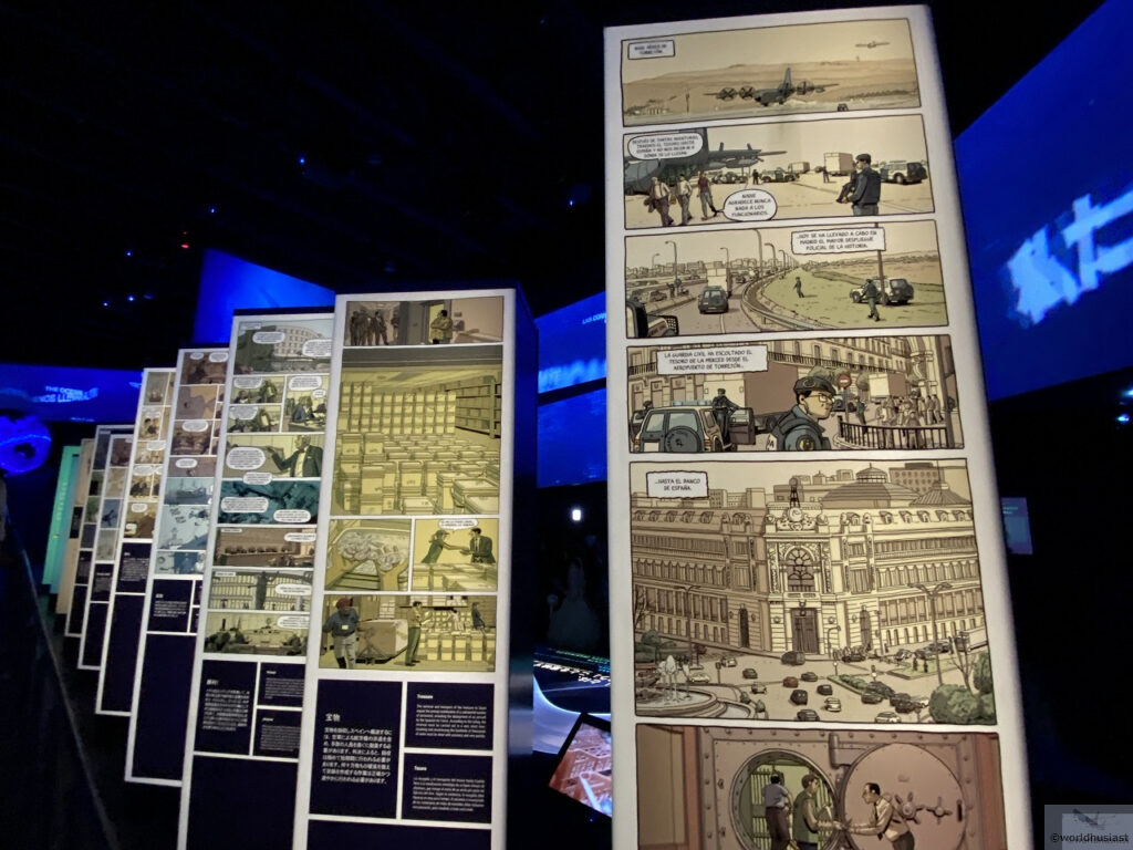 通路の両側に、主に日本とのかかわりに関連する説明パネルと展示品が置かれていました。進行方向左側には漫画もありましたが残念ながらスペイン語。枠外には日本語の解説があります。個人的には暗いところで小さい字なのでよく見えず。。
