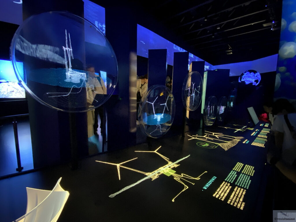 さらに下ると風力発電の解説があり、その先に実験装置のような展示があり、その上では「Currents that lead us to the future」などと文字が泳いでいきます。