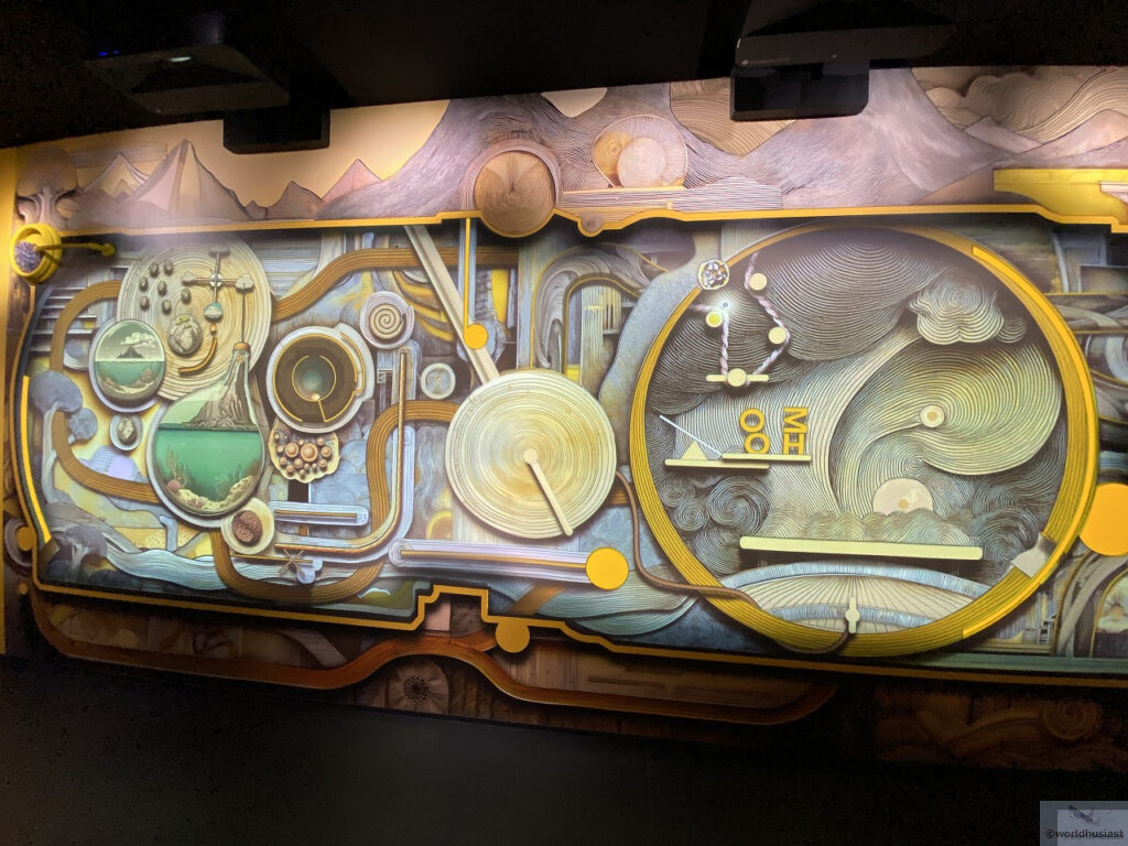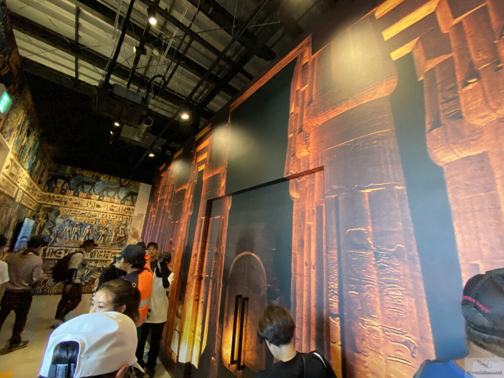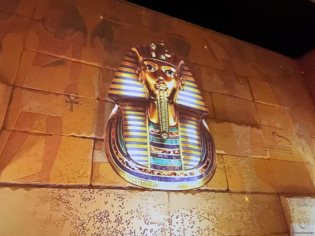 この部屋ではアラビックな音階の音楽と共に、ピラミッドなどのエジプトの遺跡やツタンカーメンの黄金のマスクが映し出される2分ほどのムービーを鑑賞します。壁一面に投影されますが、全方位ではなく正面があるCG映像でした。映像では特に説明はありませんが、なんとなく理解できると思います。
