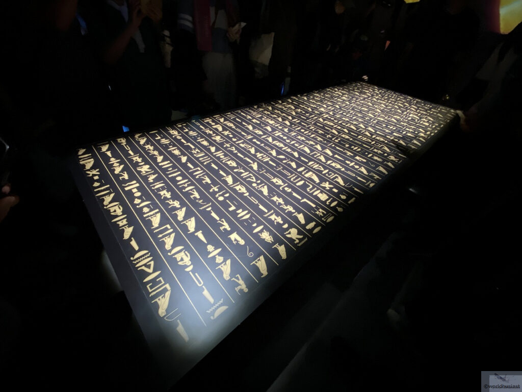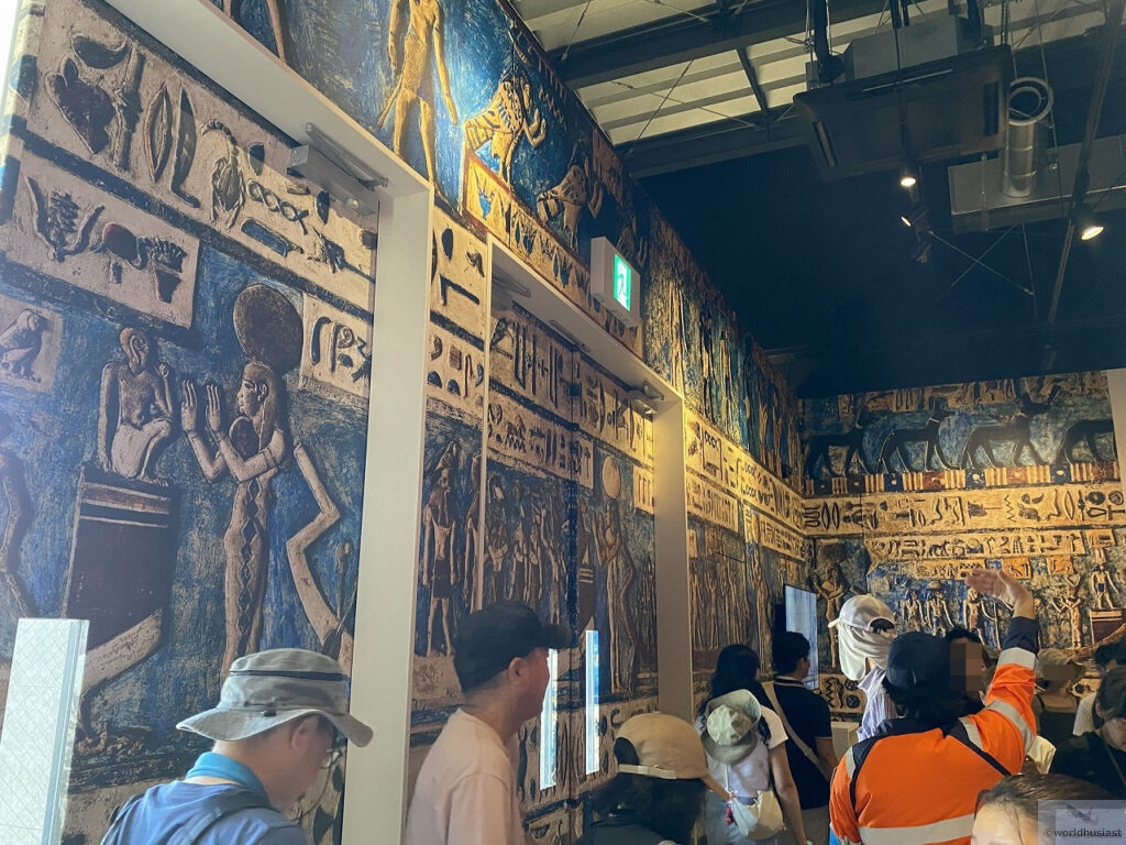 レリーフを模した壁紙は、実はドバイ万博のエジプト館2階にあったものと同じデザインです。次のリヤド万博でもお目にかかれることを期待しています。