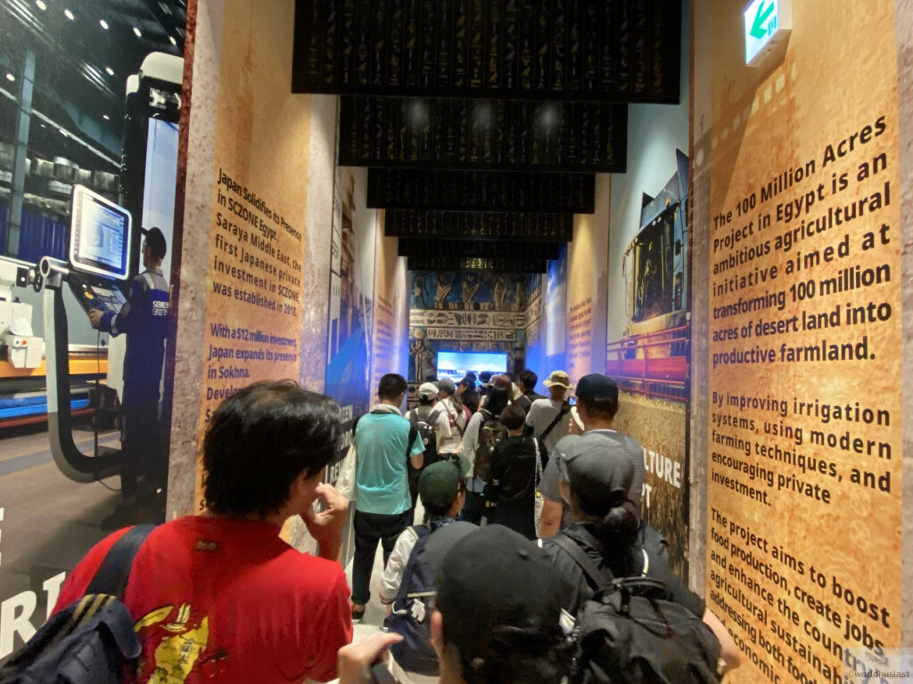 ドバイ万博のときは本物のミイラを持ってきちゃって大人気でしたが、今回は中クオリティのCG映像とパネルだけでした。3つの部屋を合体して客をつめこんで、映像を一気に5分で見せた方が回転は速かったかもしれないです。