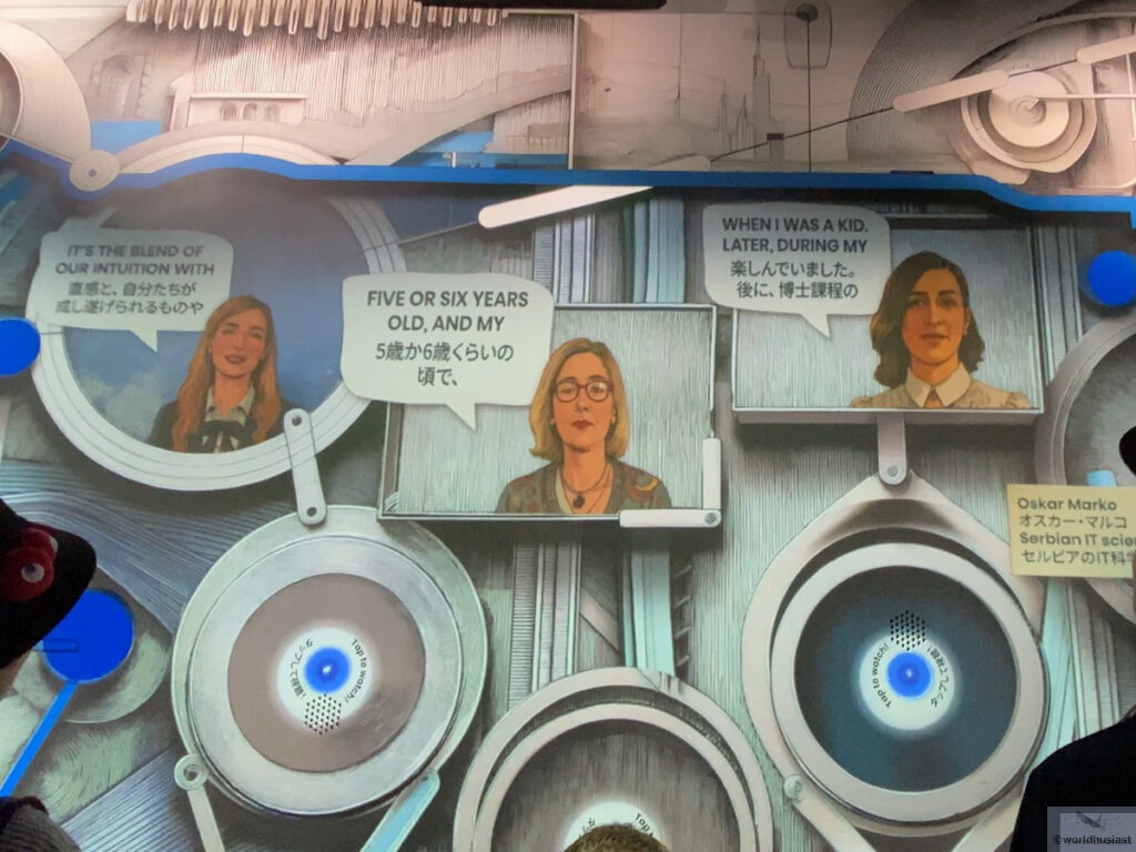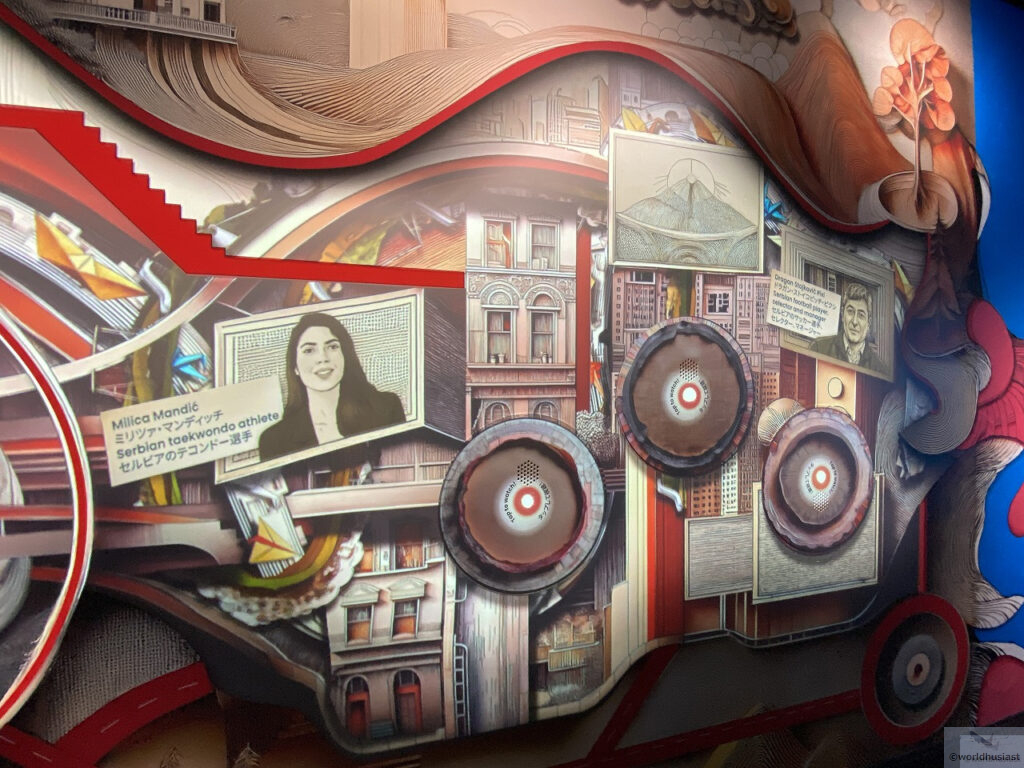 最初の小部屋では現存する最古のセルビアのキリル文字による彩飾写本「ミロスラヴ福音書」と書かれた壁があり、正面のモニターではセルビアらしい風景や競技の映像が流れる中、次の部屋にはビート版の遊びがあり、機械の隣に画面が緑になったら一組二個入れてくださいなどと説明がありました。