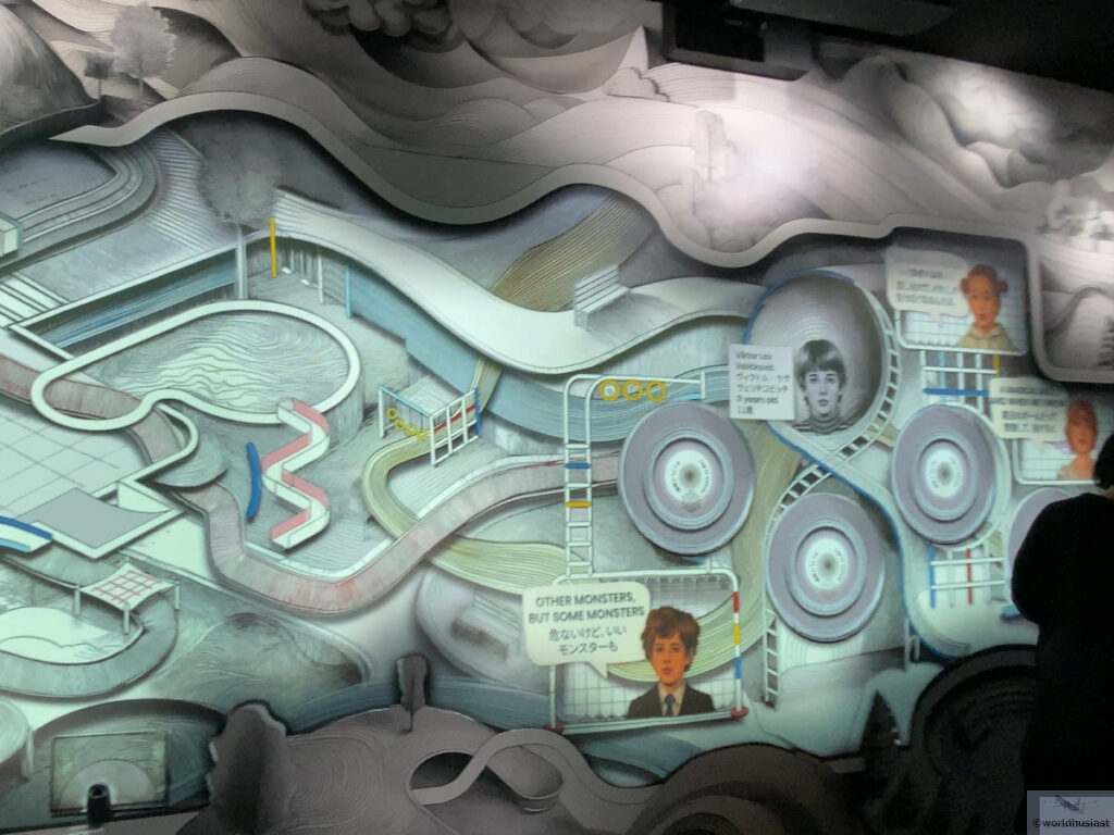 部屋を出ると狭い通路の両側に、2つめの映像の内容が英語で書かれていました。