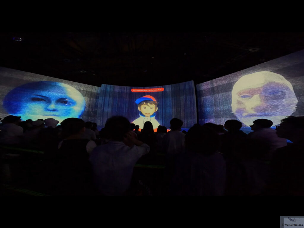 隣の部屋に入ると、2035年からやってきた「ミリ」(実演)と画面両脇の「アルファ」(右のおじさん)と「オメガ」(左の女性)の案内でショーが進んでいきます。