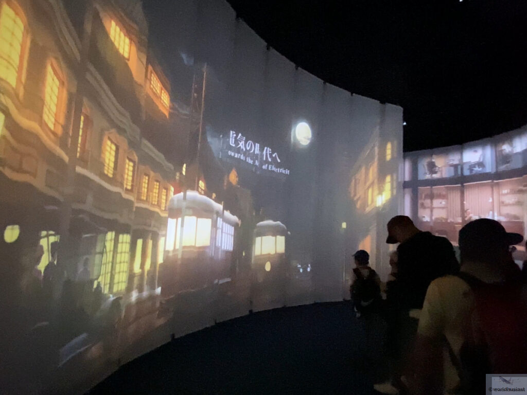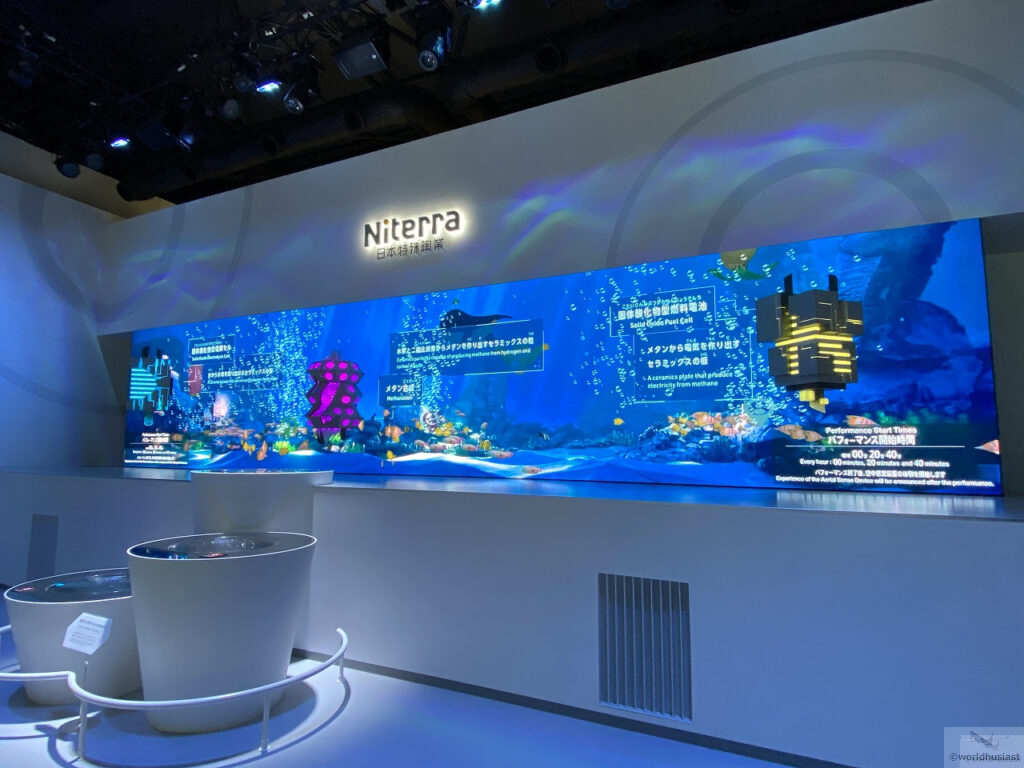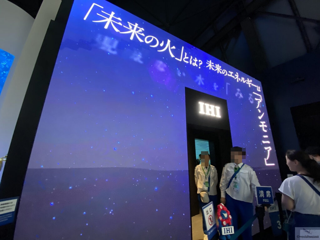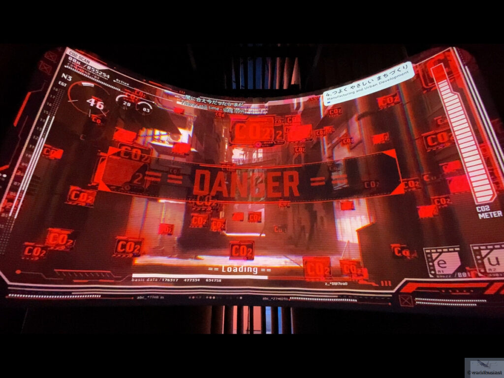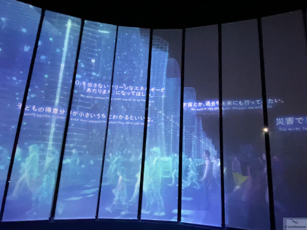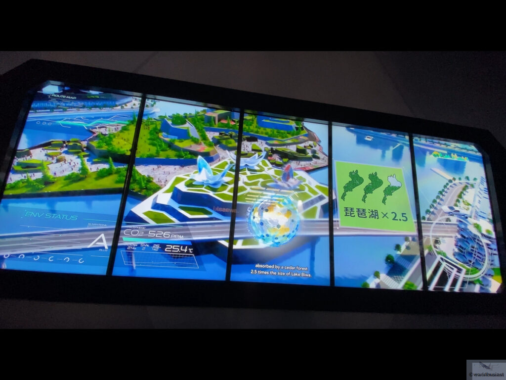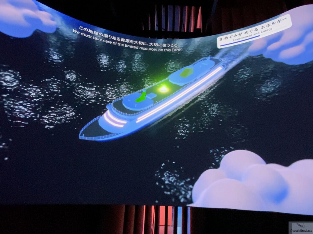 激狭部屋で3方位の壁に映し出される3分30秒程の動画鑑賞。「水の旅」は水の脅威にAIとデータ収集で対応する未来型水管理システム、「火の旅」では燃やしてもCO₂を出さないアンモニアにより電気を生み出す世界初の技術があることを紹介。字幕が下にあるので後ろの方だと見にくい仕様なのが残念。
