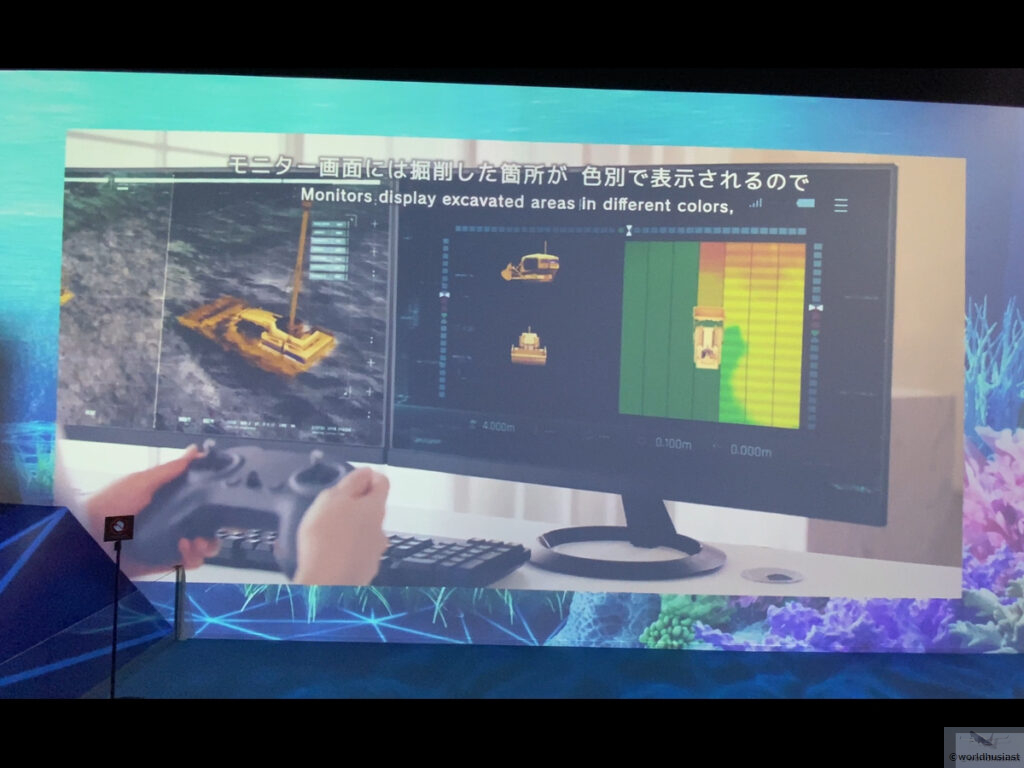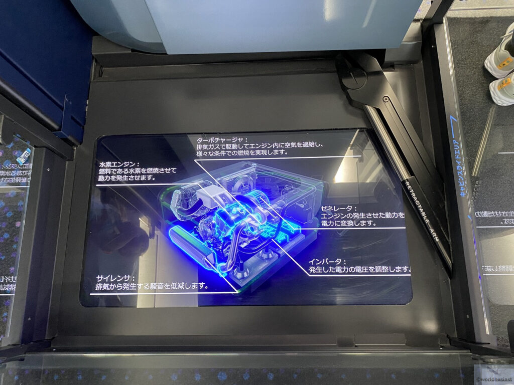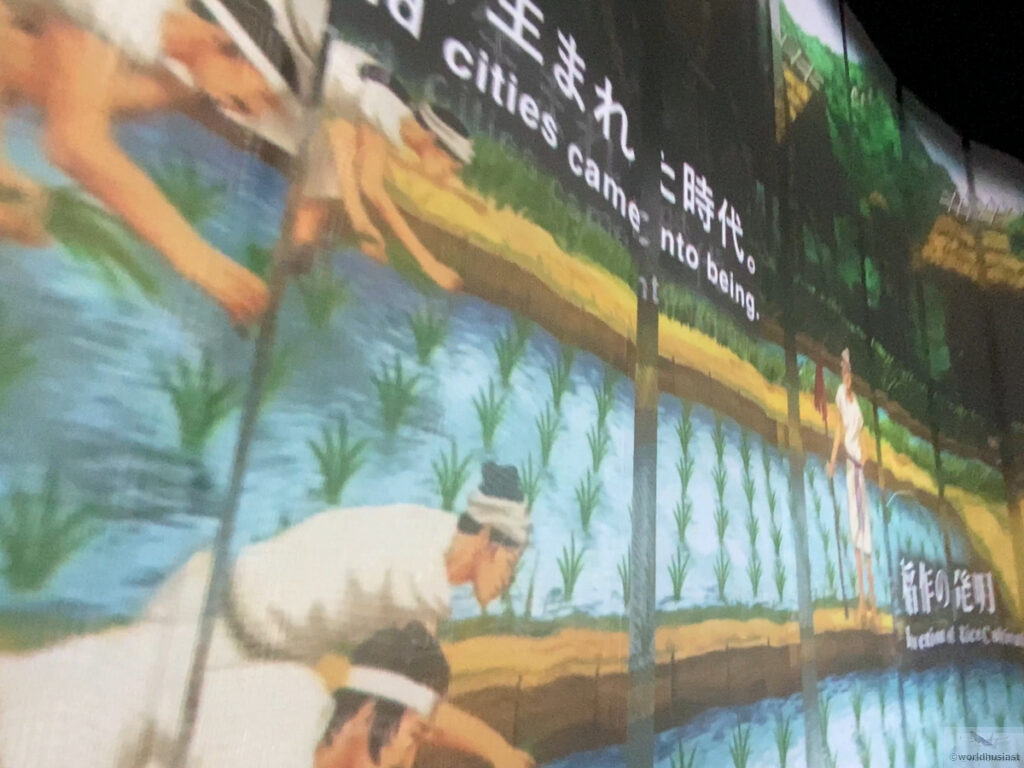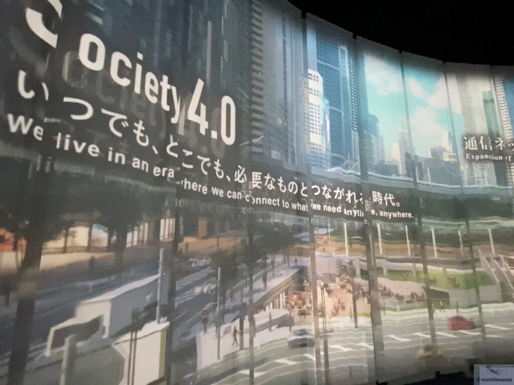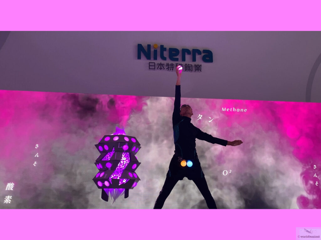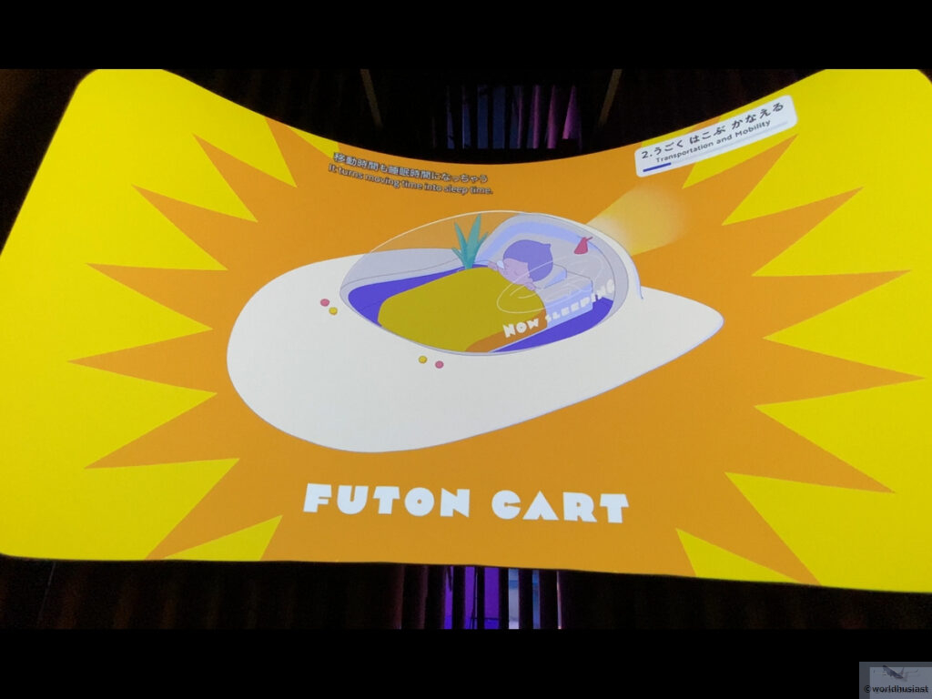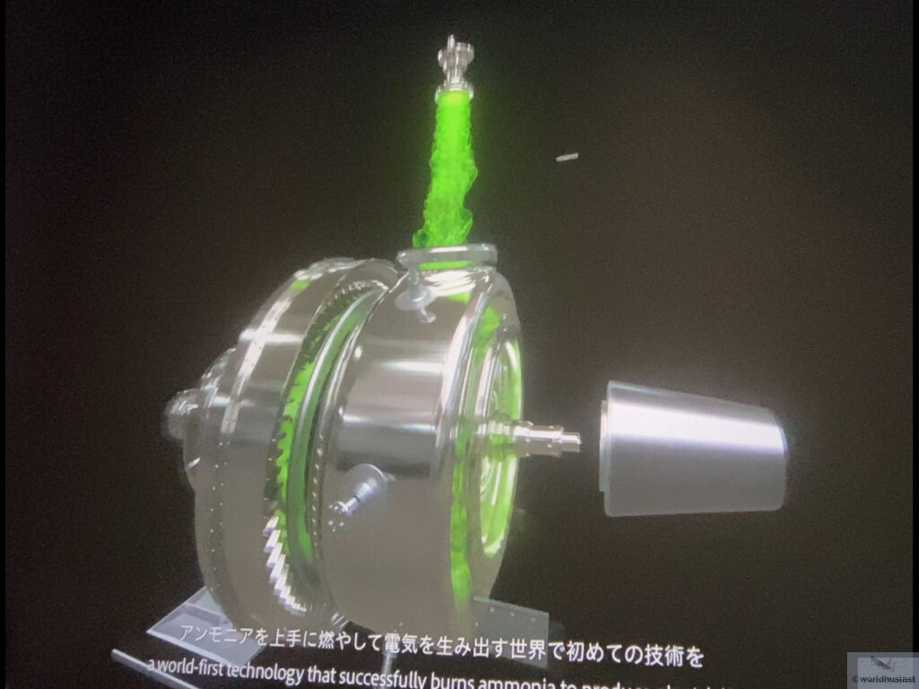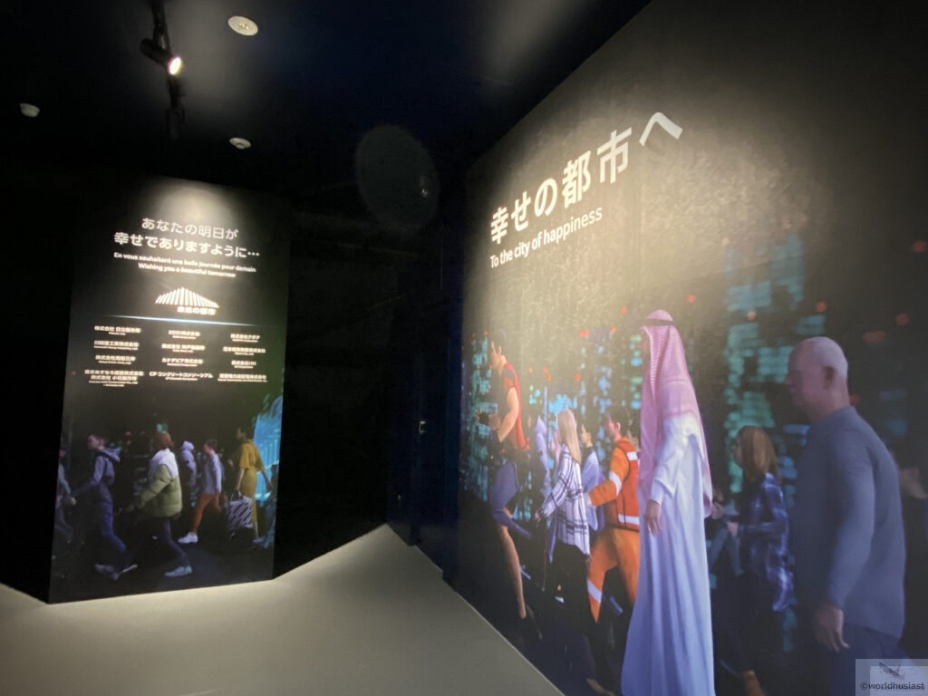 激狭部屋で3方位の壁に映し出される3分30秒程の動画鑑賞。「水の旅」は水の脅威にAIとデータ収集で対応する未来型水管理システム、「火の旅」では燃やしてもCO₂を出さないアンモニアにより電気を生み出す世界初の技術があることを紹介。字幕が下にあるので後ろの方だと見にくい仕様なのが残念。