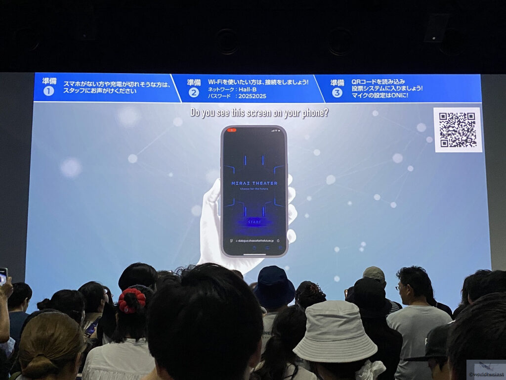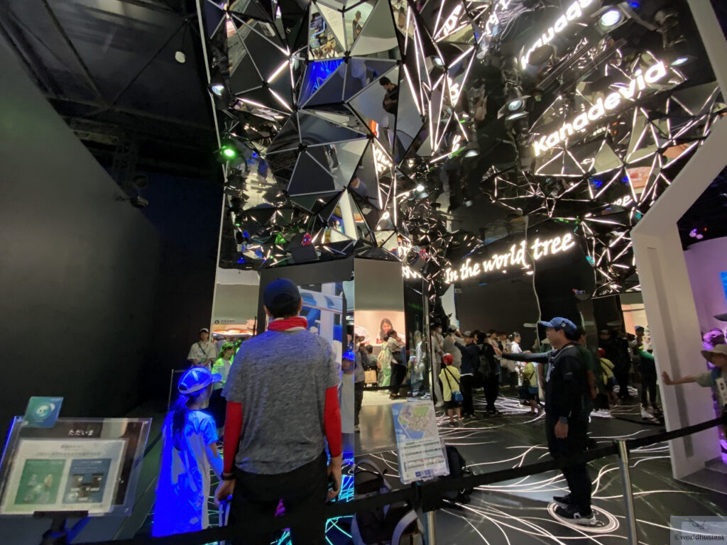 会場に入るとスマホの設定を要求されます。ただでさえパビリオン争奪戦で電池が減るスマホをここでも使って電池を減らすことになります。省電力モードは不可、マイク設定ONにするのでかなり電池が減ります。スマホがなかったり電池が少ない人は係員に言うと借りられるようです。またここだけフリーWifiがあり通信状態を気にせず楽しめるのでKDDI様々です。