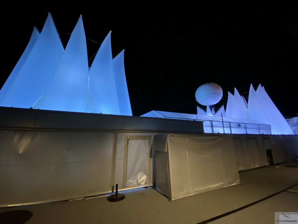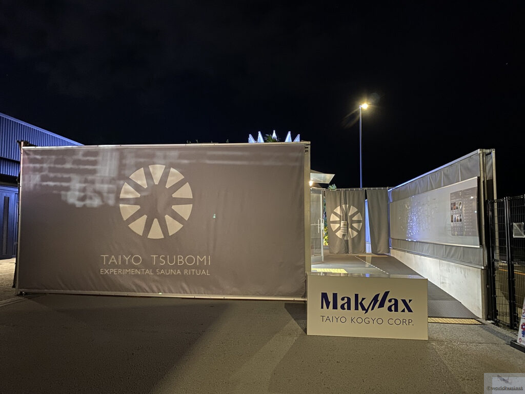 次のリチュアルは早速サウナルームに入ります。樹脂の膜でできたサウナで高さ8mほど。日中は太陽の光が差し込むそうですが、この時間はライトアップされていました。