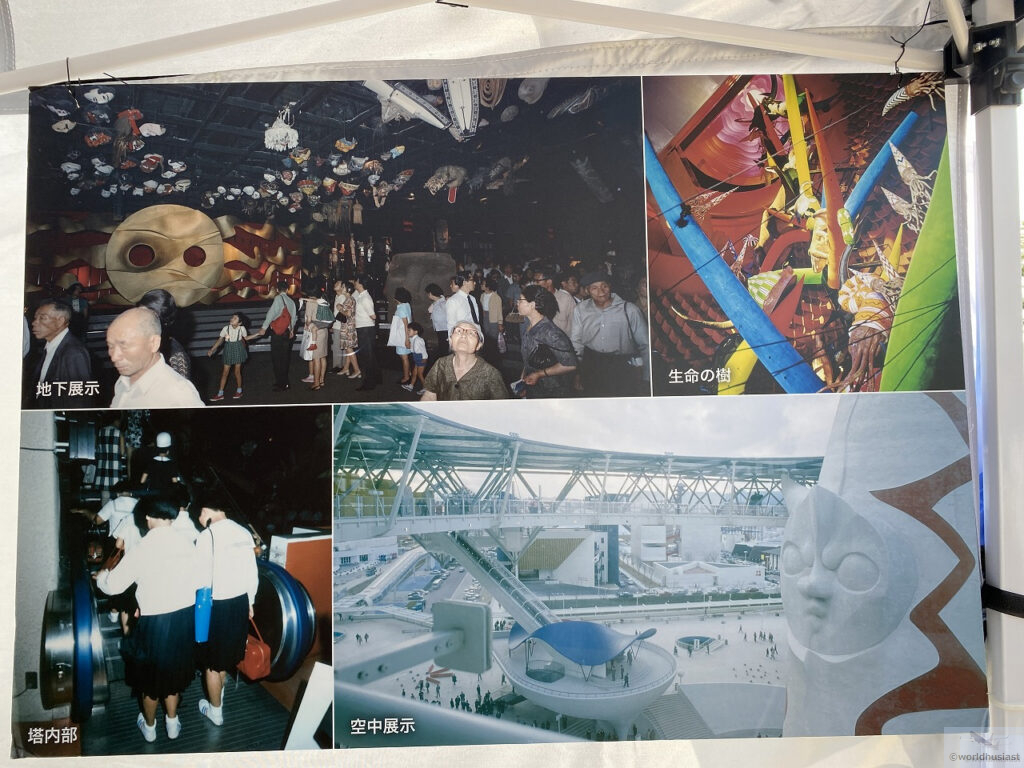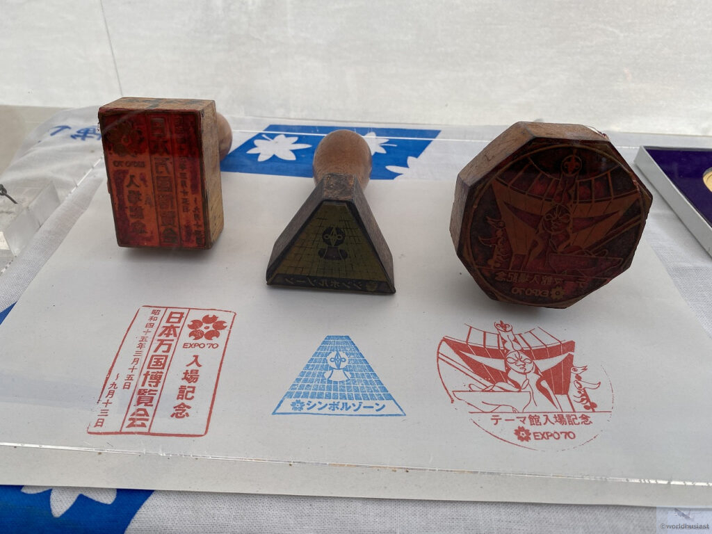 「Back to EXPO’70~もう一度、あの万博へ。1970年万博を、映像空間で完全再現!~」は、自由観覧エリアでは太陽の塔内部のオブジェのオリジナル(現在の太陽の塔内部では復元されたものを展示)や、当時のスタンプ、マップや写真などが展示されていました。