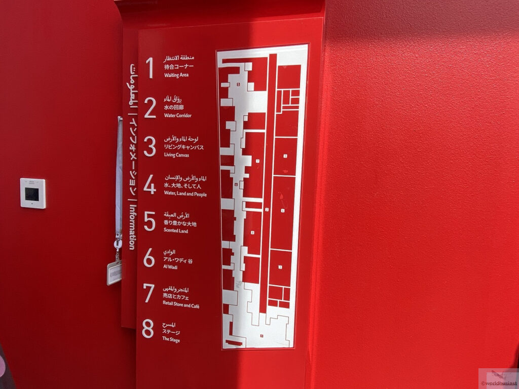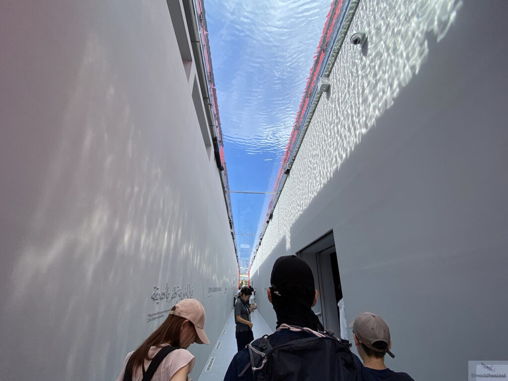 水の回廊を少しだけ歩きます。これは灌漑システム「アル・ファラジ」(アフラージ)にインスパイアされたもの。アル・ファラジとは生活用水やナツメヤシなどの農業用水のための水路で、世界遺産に登録されています。