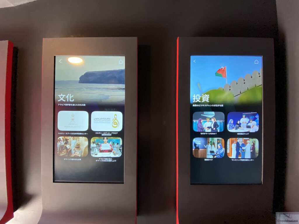 予約不要エリアには「オマーン:ひろがる絆」というコーナーがあり、観光や投資などについてタッチパネルで知ることができます。