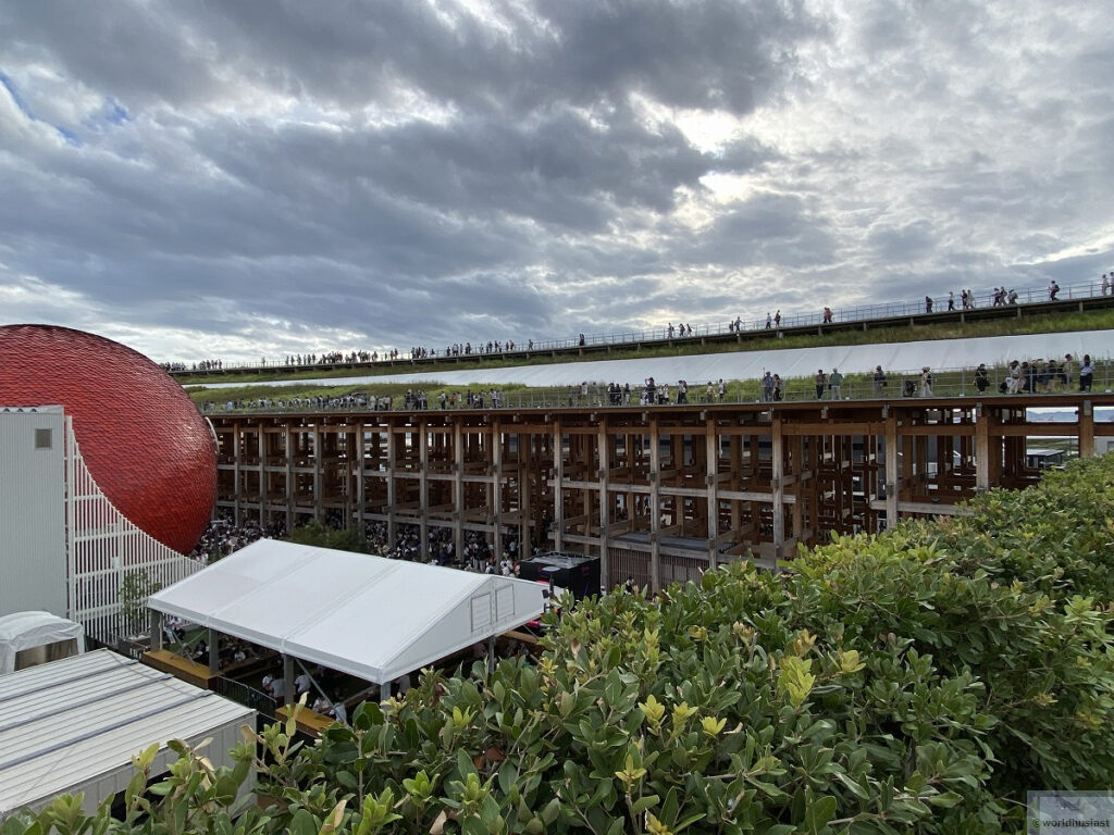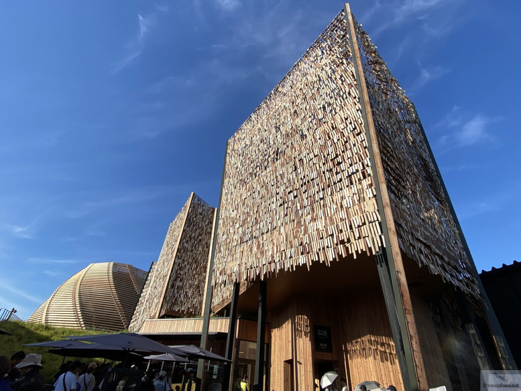 佐藤研吾建築設計事務所によるもの。福島県の木材を使っており、万博会期後には福島県に移築して地域の拠点施設となる予定とのこと。