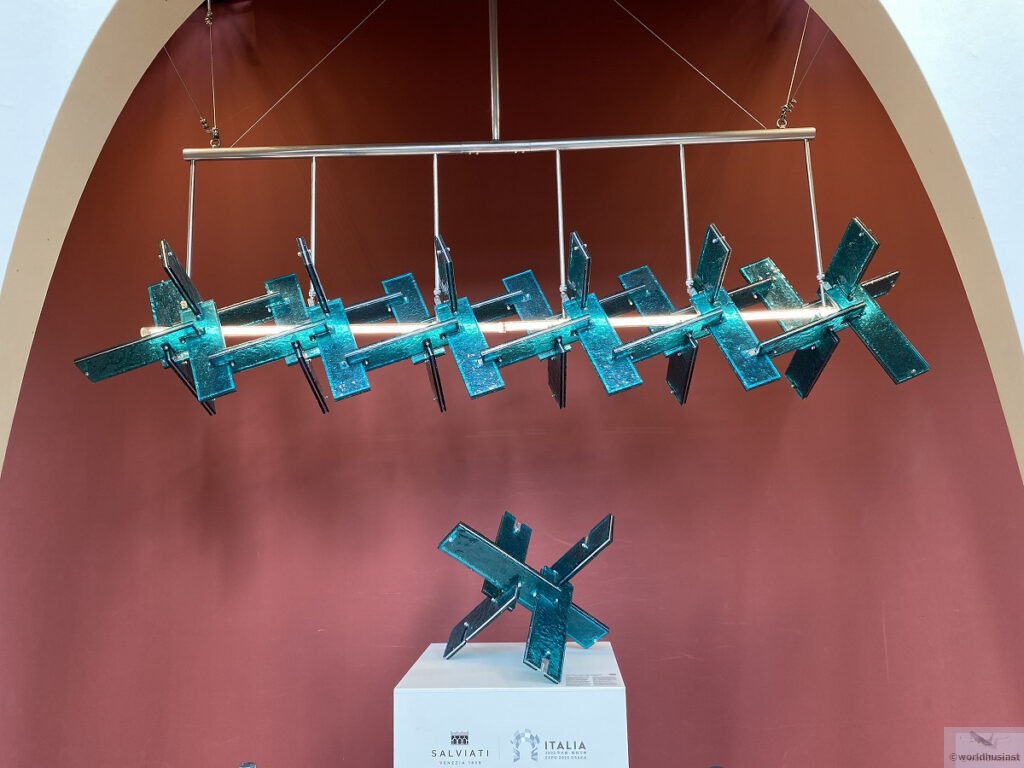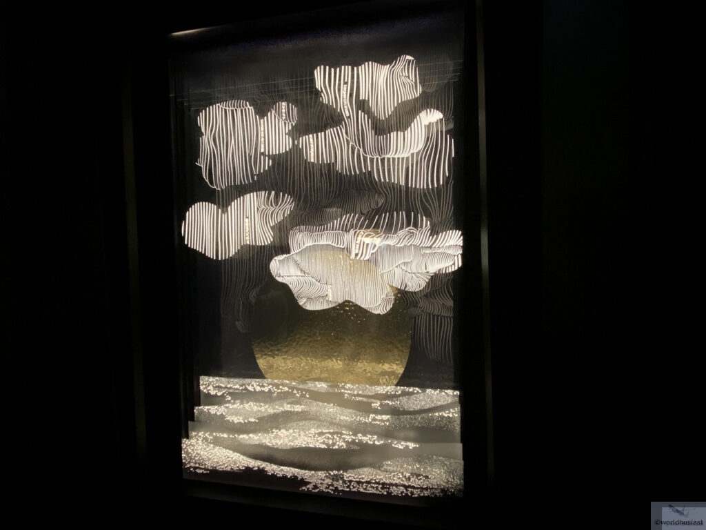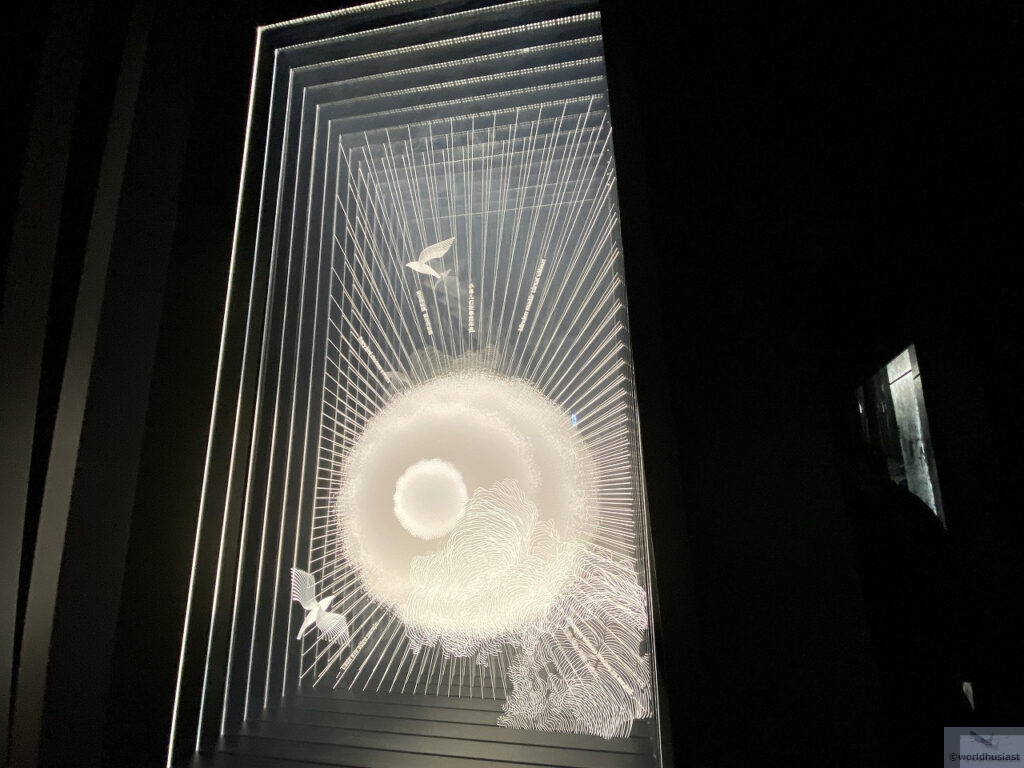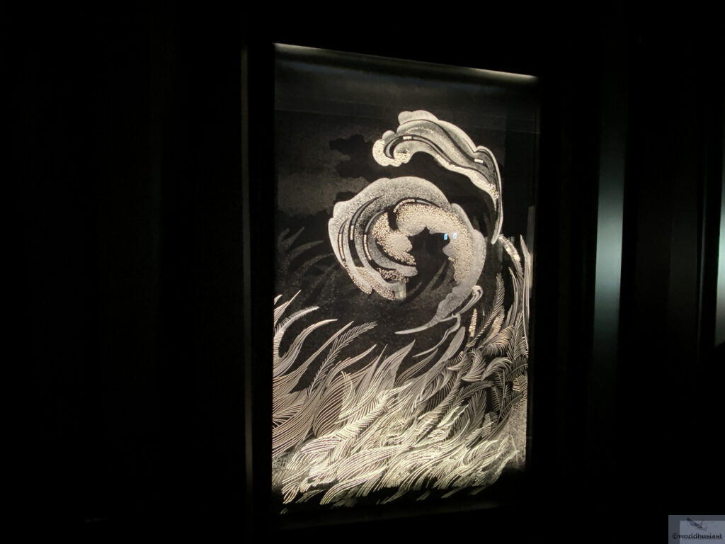 黒の世界に白くガラスアートが浮かび上がる様子はとてもきれいでした。ライティングによってアニメーション仕立てになっているものもありました。