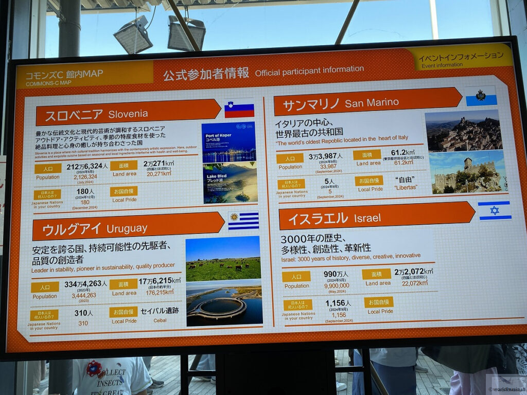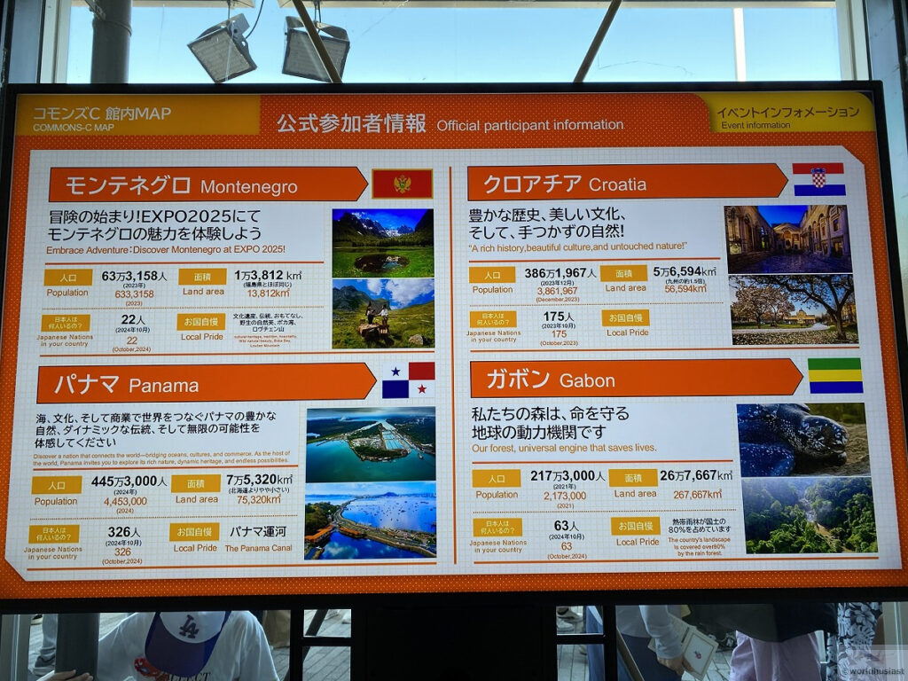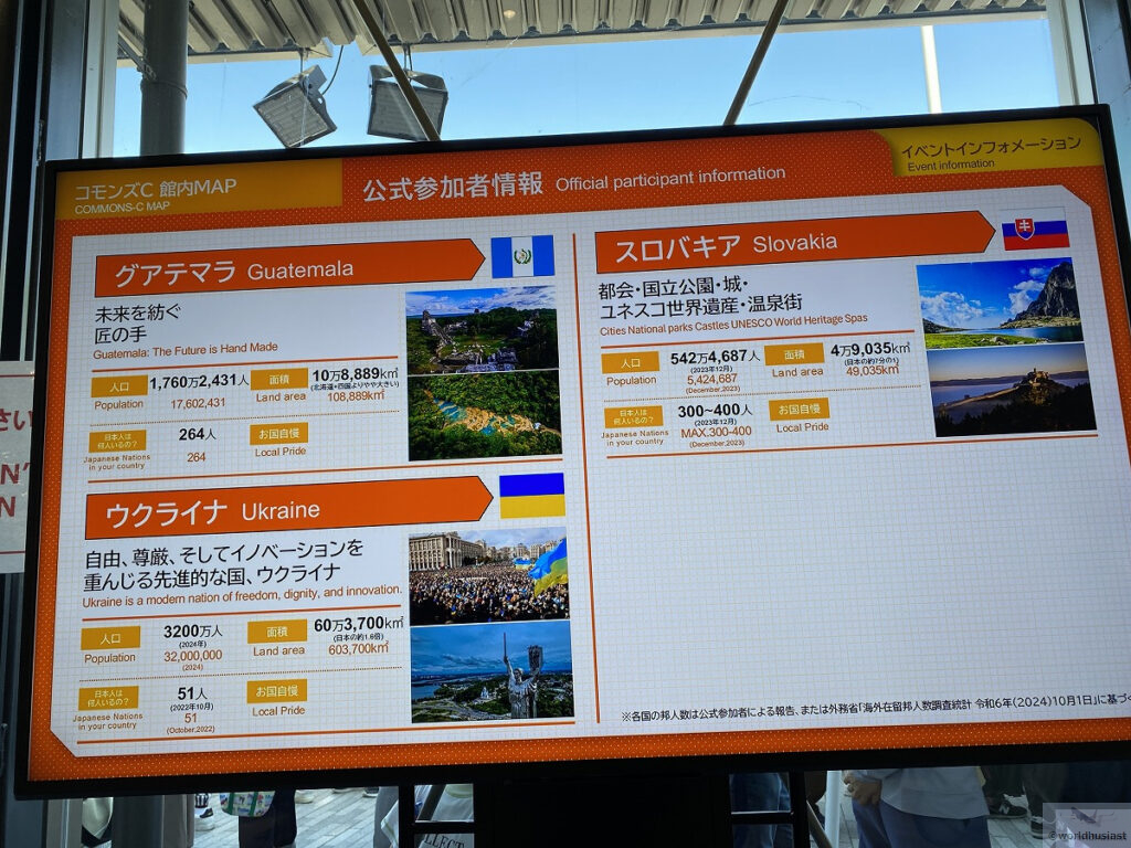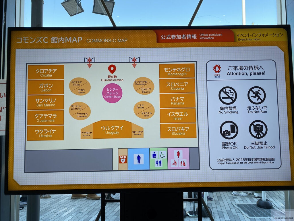11カ国が共同出展しています。コモンズの中でも展示が凝ったものが多く、各国ブースで並びます。館内が狭いので行列が一時的に締め切られることもあり、全部見るとかなり時間がかかります。