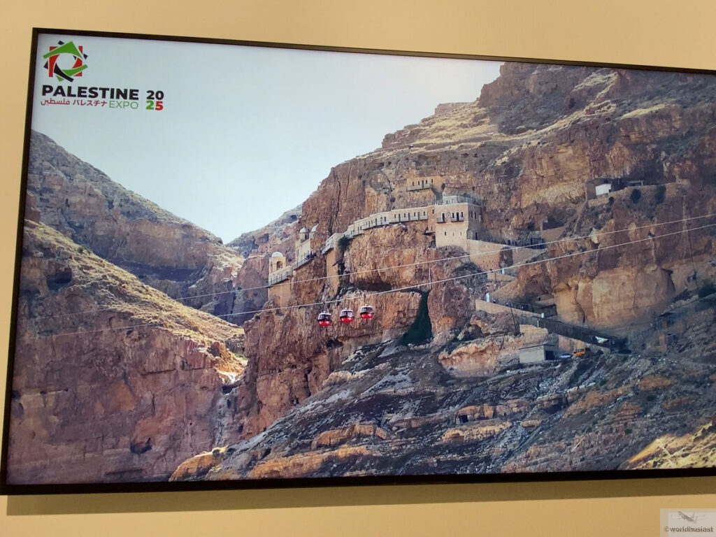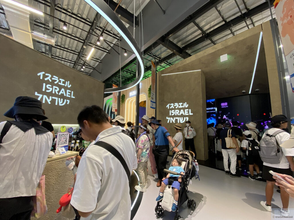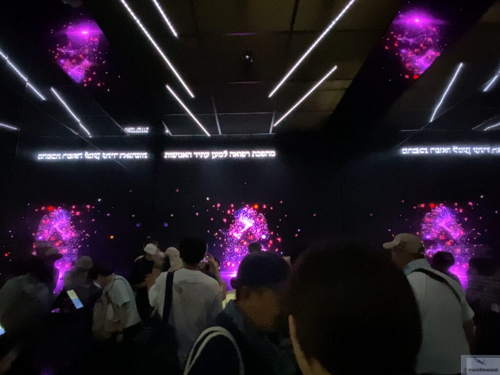 正面では、「すべての人々をもっと健康に イスラエルは医療データベースの保有量が世界第2位」「私たちの未来を守る イスラエルはテクノロジー企業が世界で最も多い国」「イスラエルはすべての人々の社会的平等を推進」といった文字が現れます。3分30秒で一周する内容で、繰り返し流れていました。