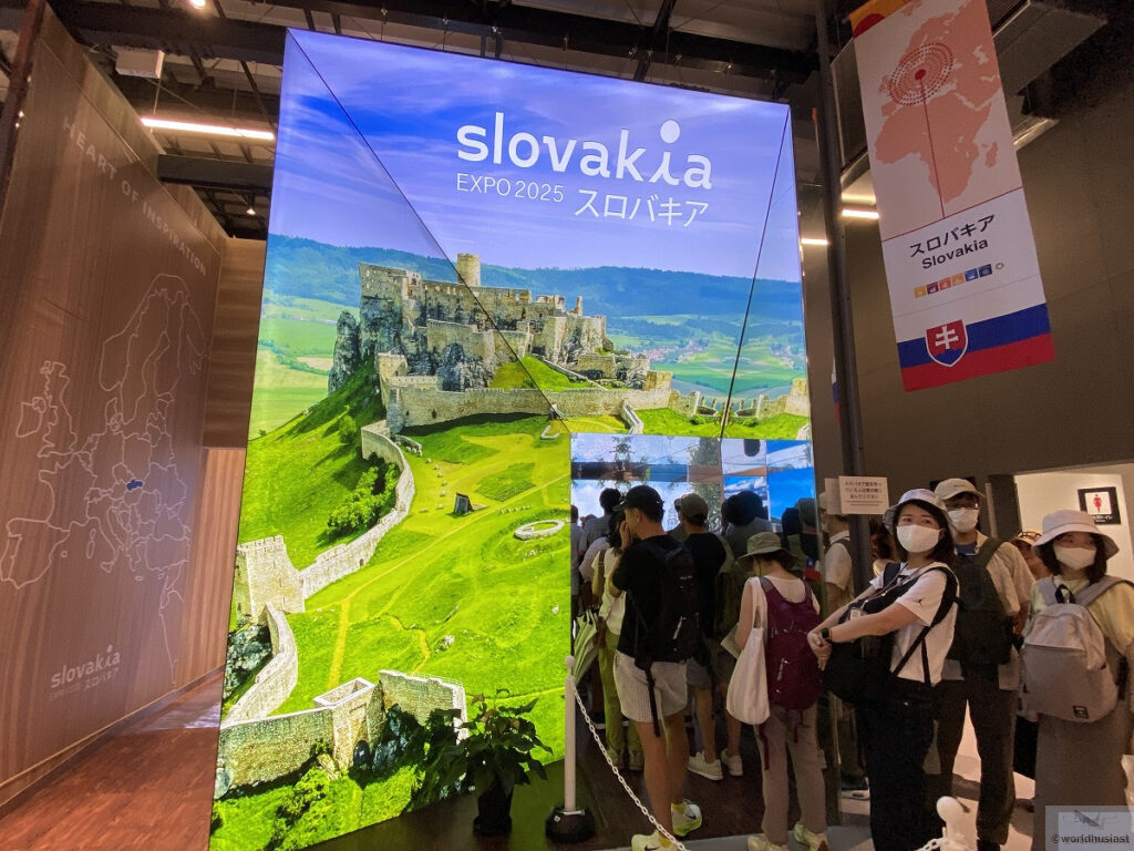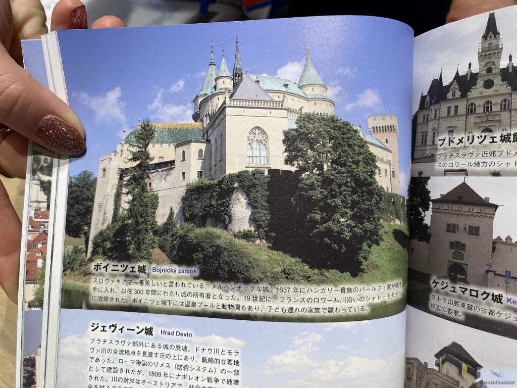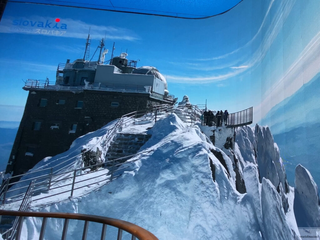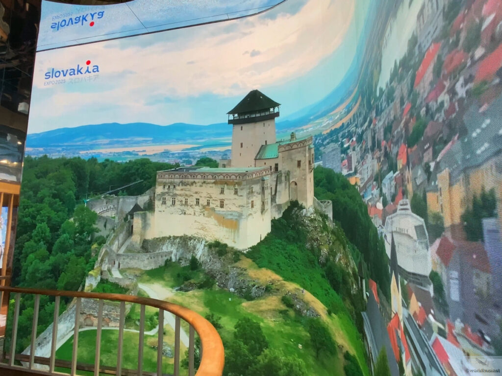 展示室では、前時代感のあるテクノに乗せて、湾曲した大きなスクリーンにスロバキアのイメージ映像が流れていました。入口の世界遺産スピシュ城の写真もですが、映像中にもお城が何度も出てきており、お城推しというのがよくわかります。そういえばスタンプもボイニツェ城でした。