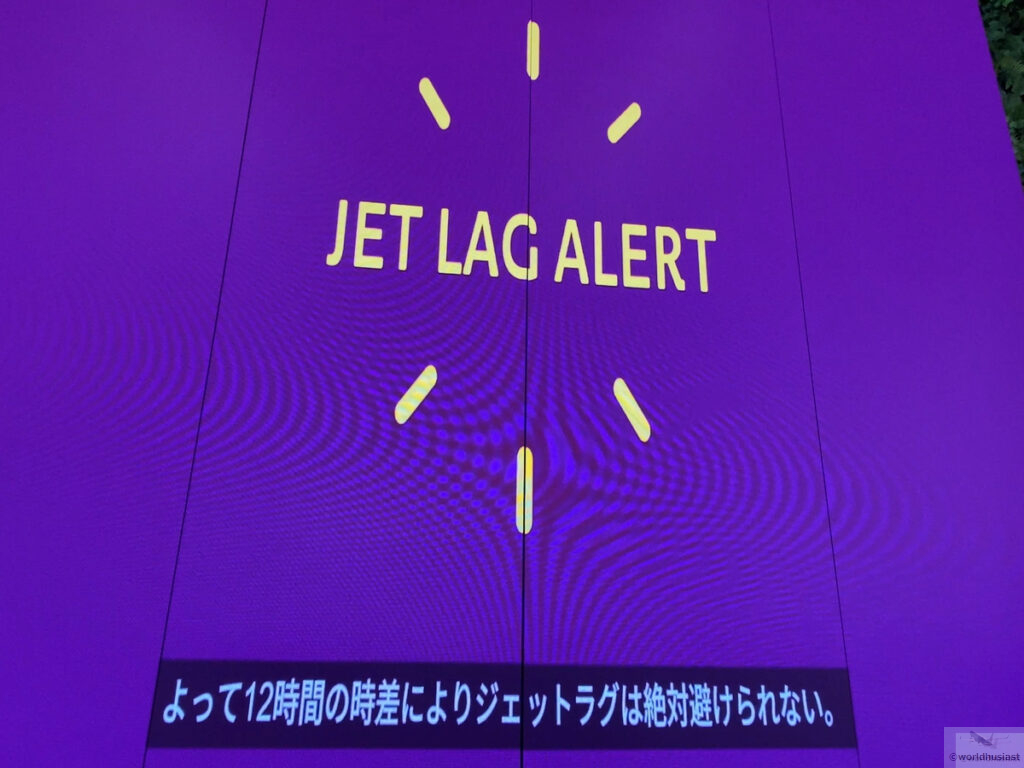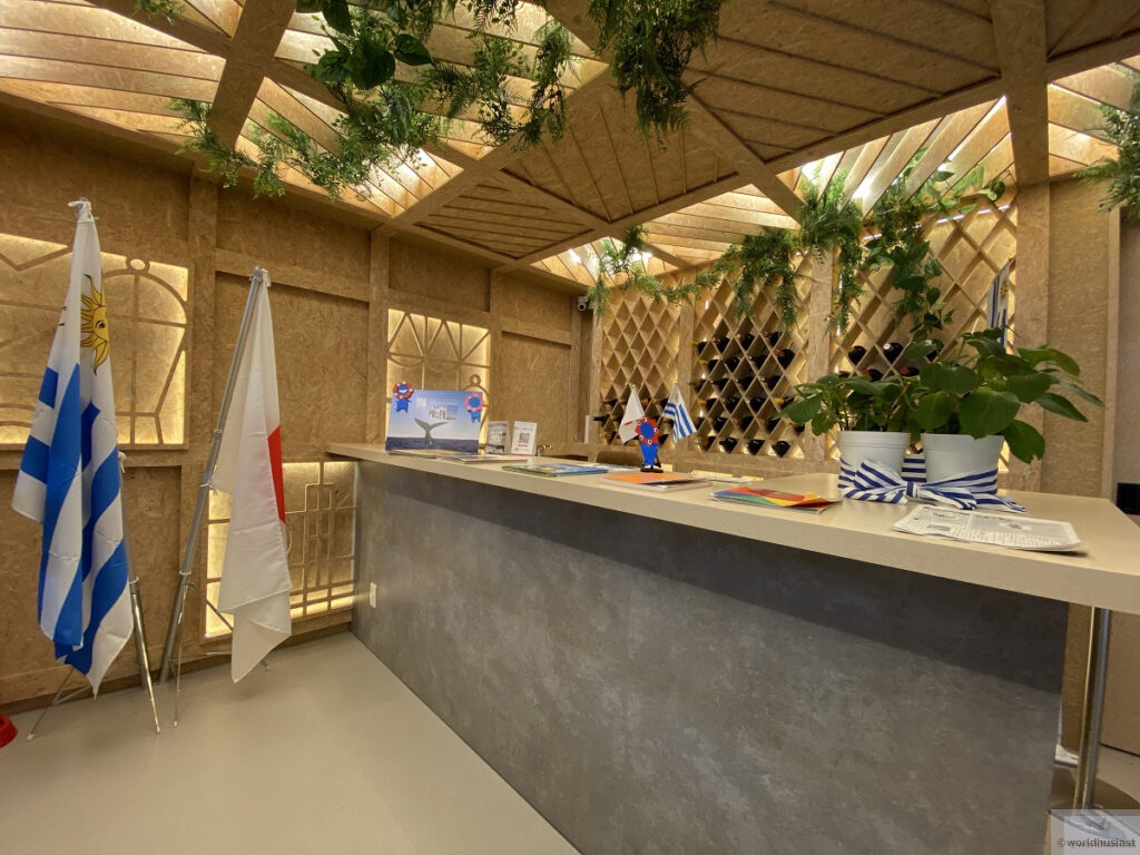 正面のモニターでは、50秒程度の動画が流れており、回転率の面からは非常によかったです。ウルグアイはイノベーションそのものだという内容に加え、「12時間の時差によりジェットラグは絶対避けられない」などと書かれていて吹き出しそうになりました。