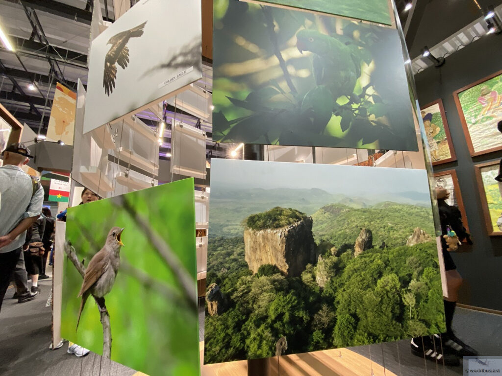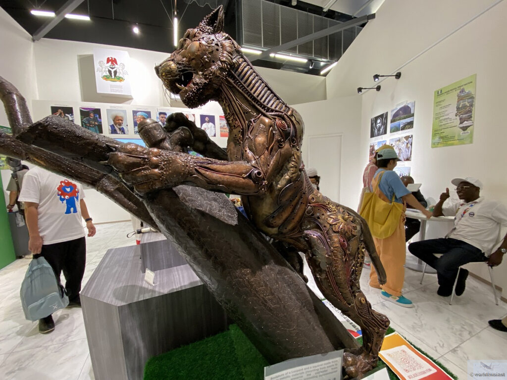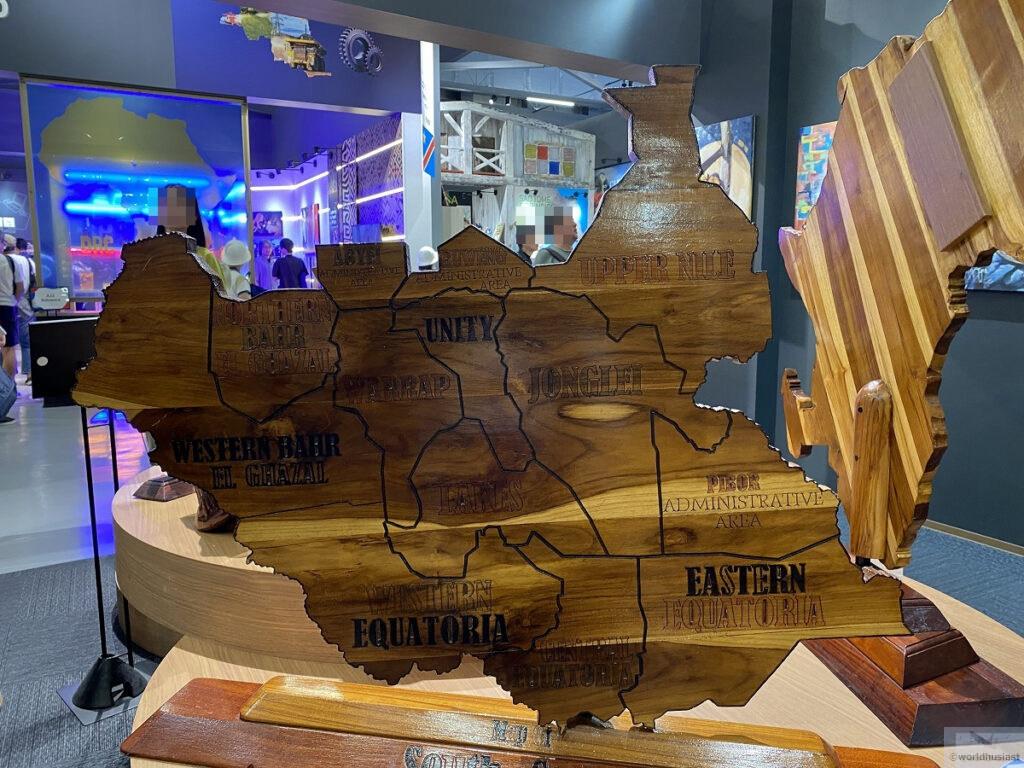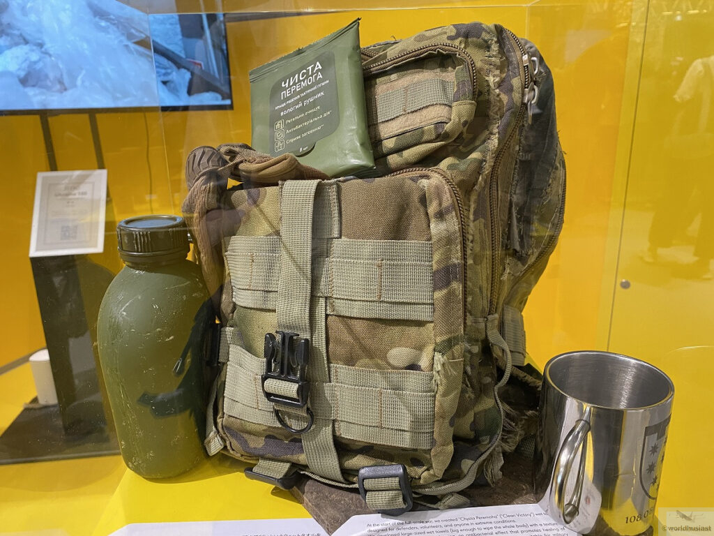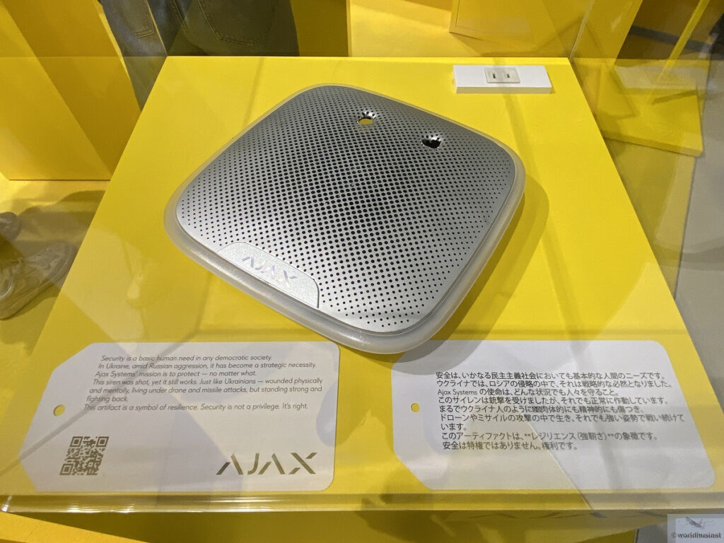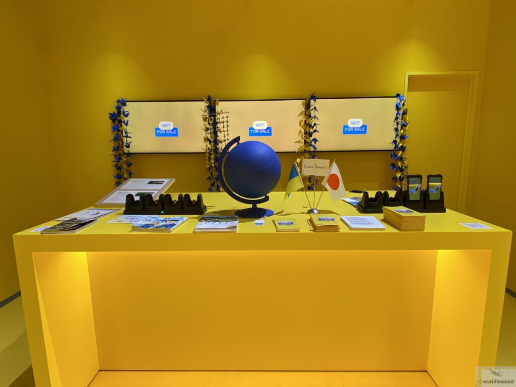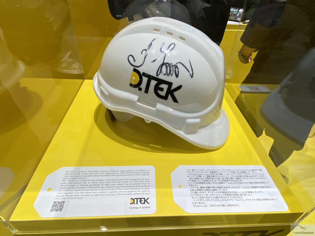 ウクライナ企業によるものや戦争関連の展示がありました。戦争下でも大豆から作った魚などの養殖に使うえさの開発をしていることや、国営石油会社、戦時下で有効なウエットタオル、退役軍人や障碍者などの支援プログラムを行う銀行などが紹介されていました。戦時下で働くエネルギー産業の労働者の不屈の精神をヘビー級チャンピオンのサイン入りヘルメットで表現しているなどユニークです。