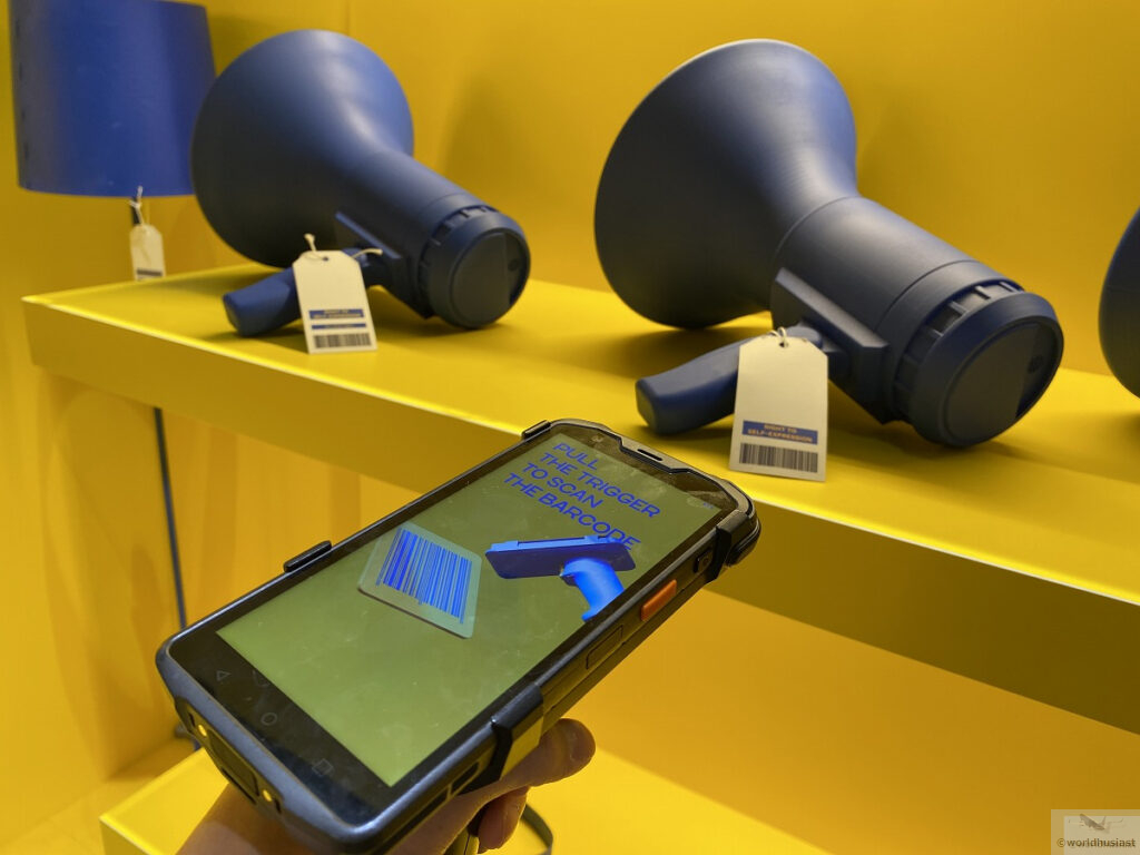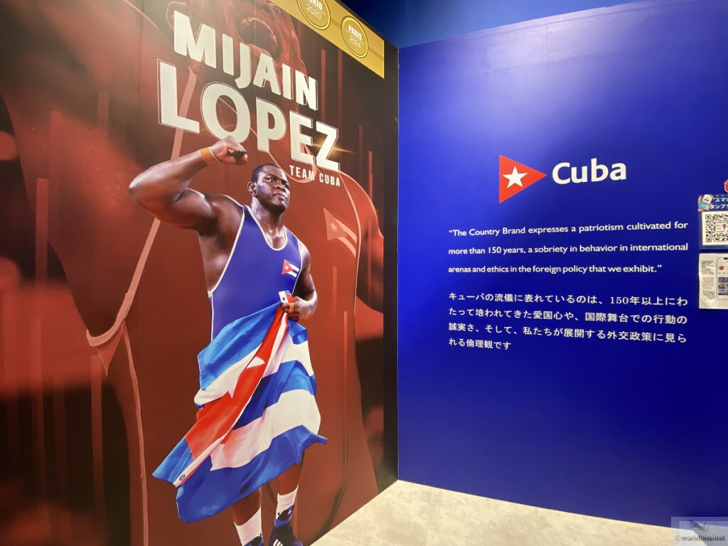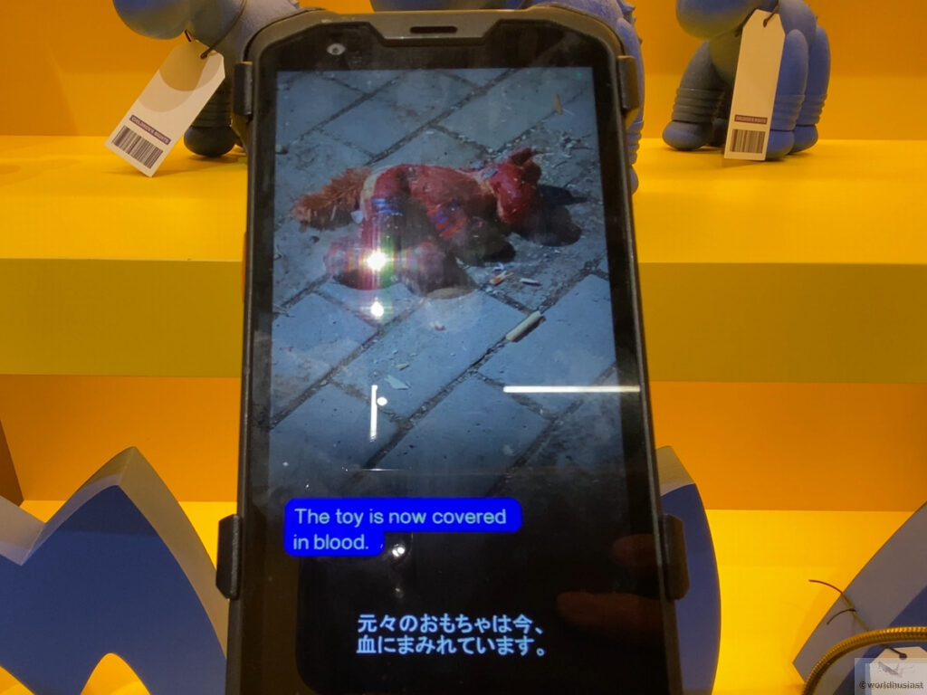 国旗のカラーリングに統一された展示室では、オブジェについているバーコードを読み込むとデバイスにオブジェに関連する動画が表示される仕掛けです。