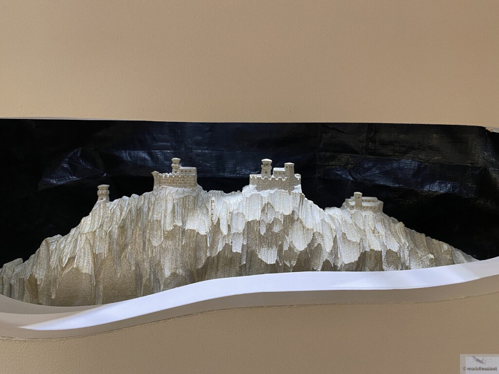1つ目のセクションは「山を感じる」。ティターノ山の岩石と、サンマリノで有名な3つの塔をイメージした小さな彫刻がありました。