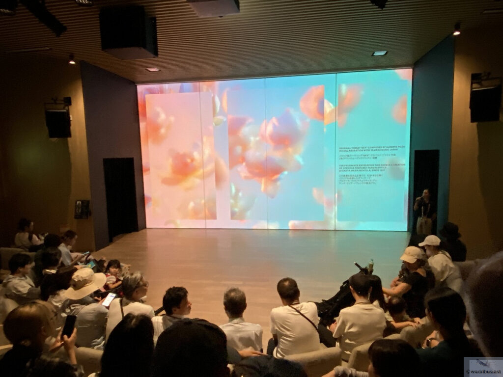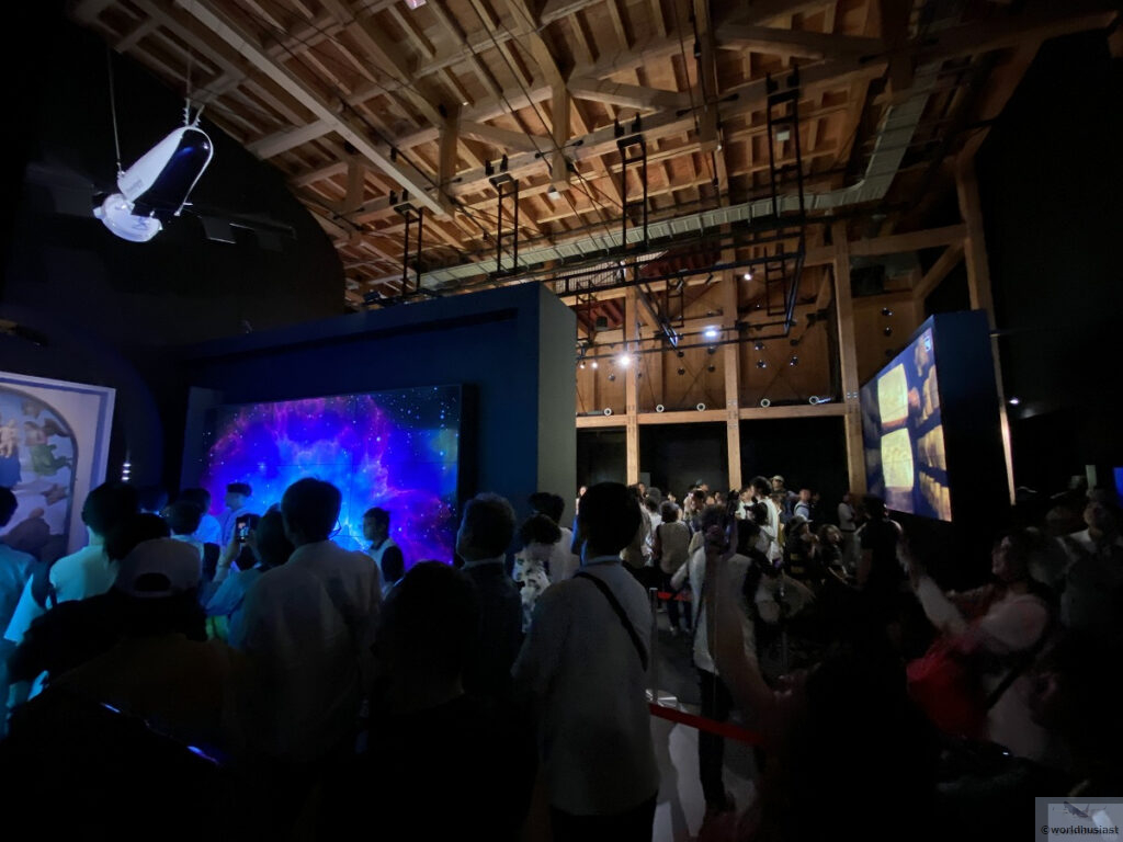 奥まで人を入れるので、人だかりで奥側の映像は全然見えませんし、奥に入ると今度は手前に流れる映像が見られないという仕様。