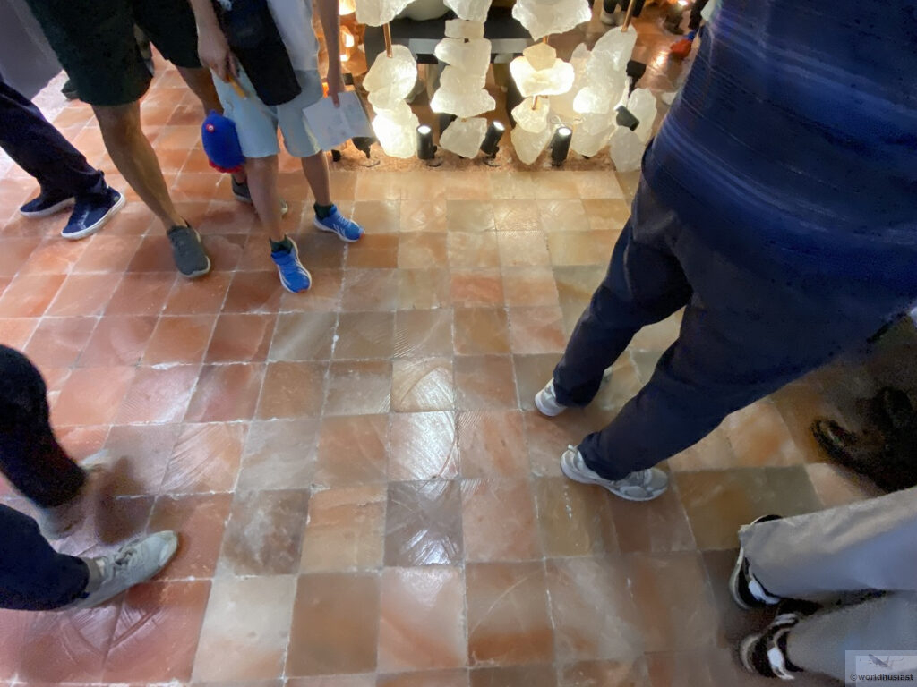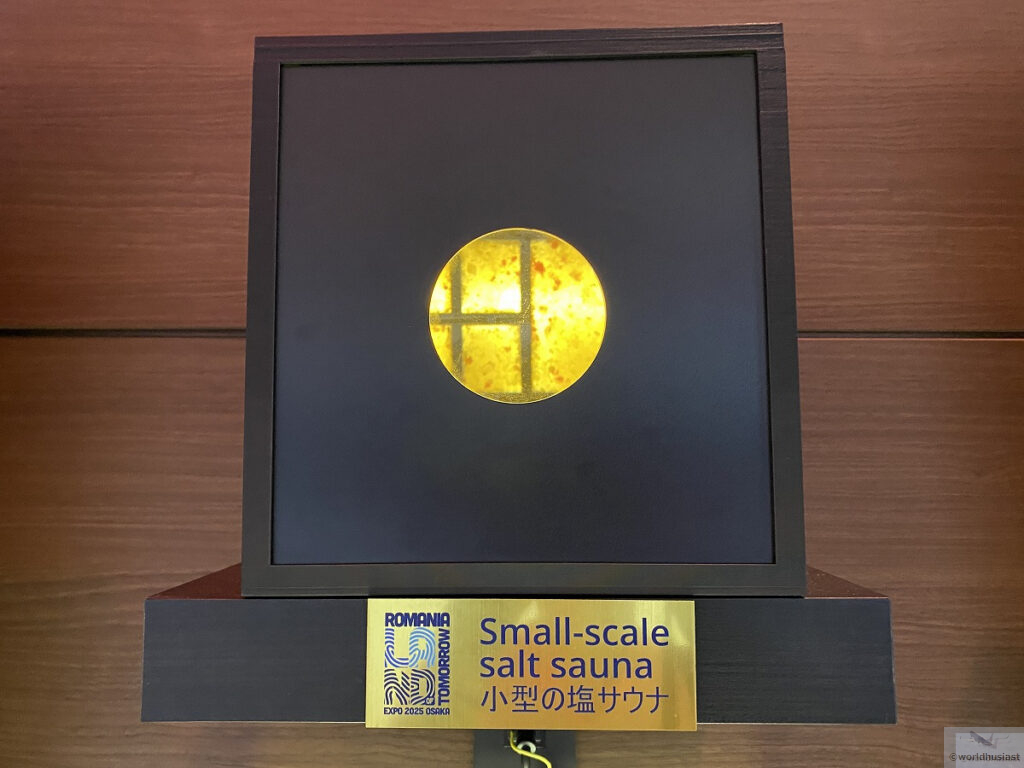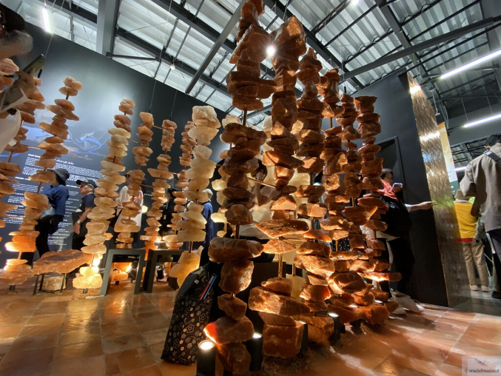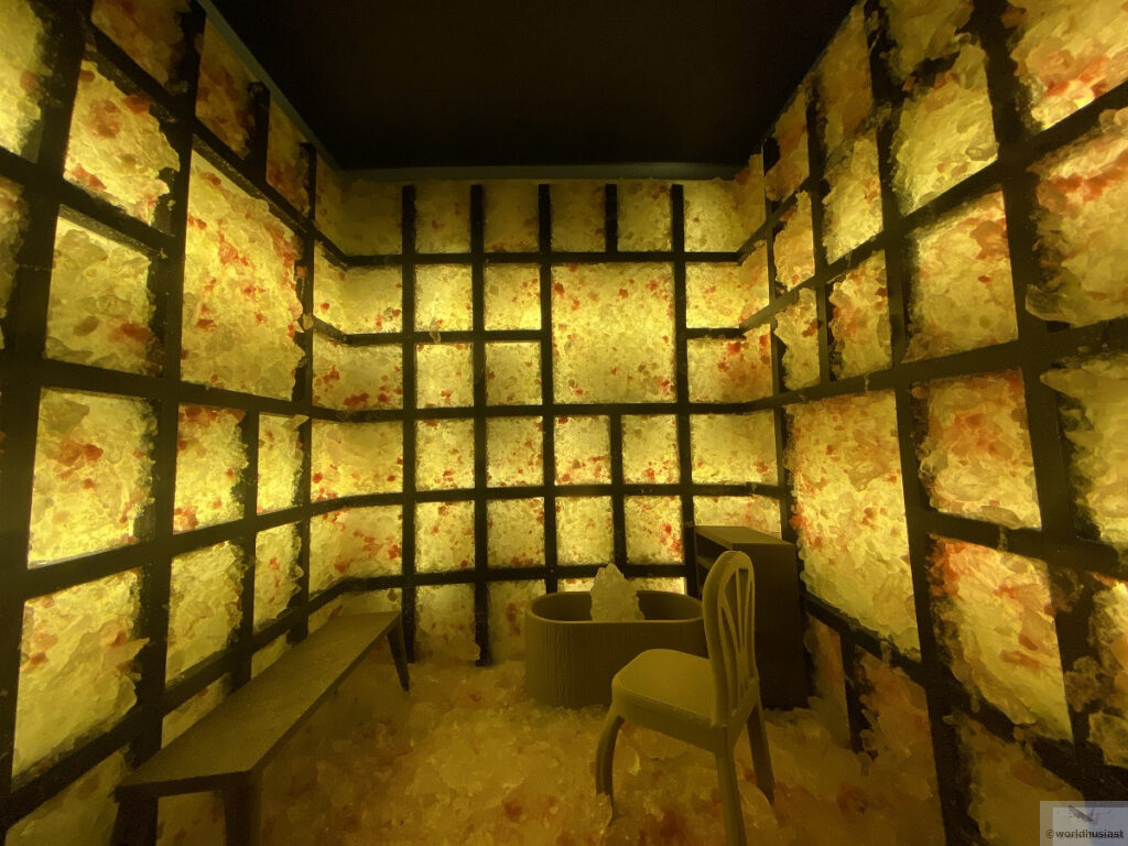 アート作品の空間を抜け、奥にある小さめの部屋で木と塩水の香りでリラックス。係員によると、現地では塩水濃縮施設があり吸入療法などを行っているとか。パビリオンで飾ってあるのは四国などから運んだクロモジの木ですが、現地は別の木を使っているとのこと。