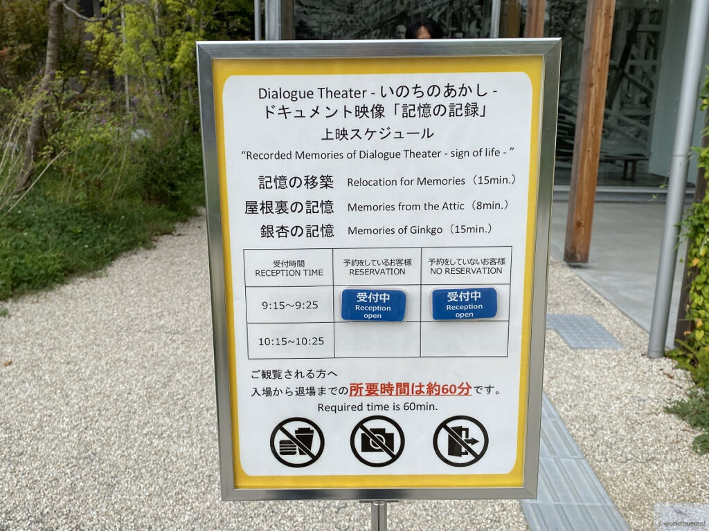 参加したときは、「記憶の移築」「屋根裏の記憶」「銀杏の記憶」の3本を一気見するもので、1時間弱の拘束、途中退出不可です。いずれも撮影禁止(スマホを使うこと自体禁止=他の当日登録を探すのは不可です)。