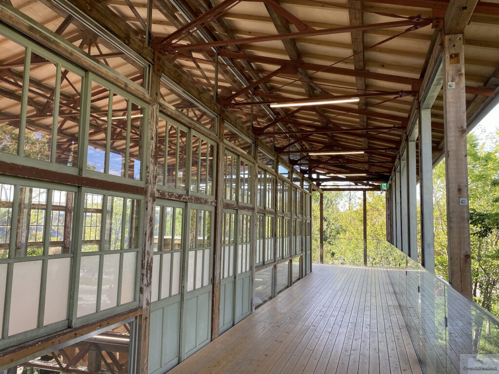 廃校となった奈良県十津川村立折立(おりたち)中学校と京都府福知山市立細見小学校中出分校の校舎を一部移築したもので、外観はとても趣があります。校舎にとっても、こんなにたくさんの人の目に触れることはずいぶん久々だったことでしょう。