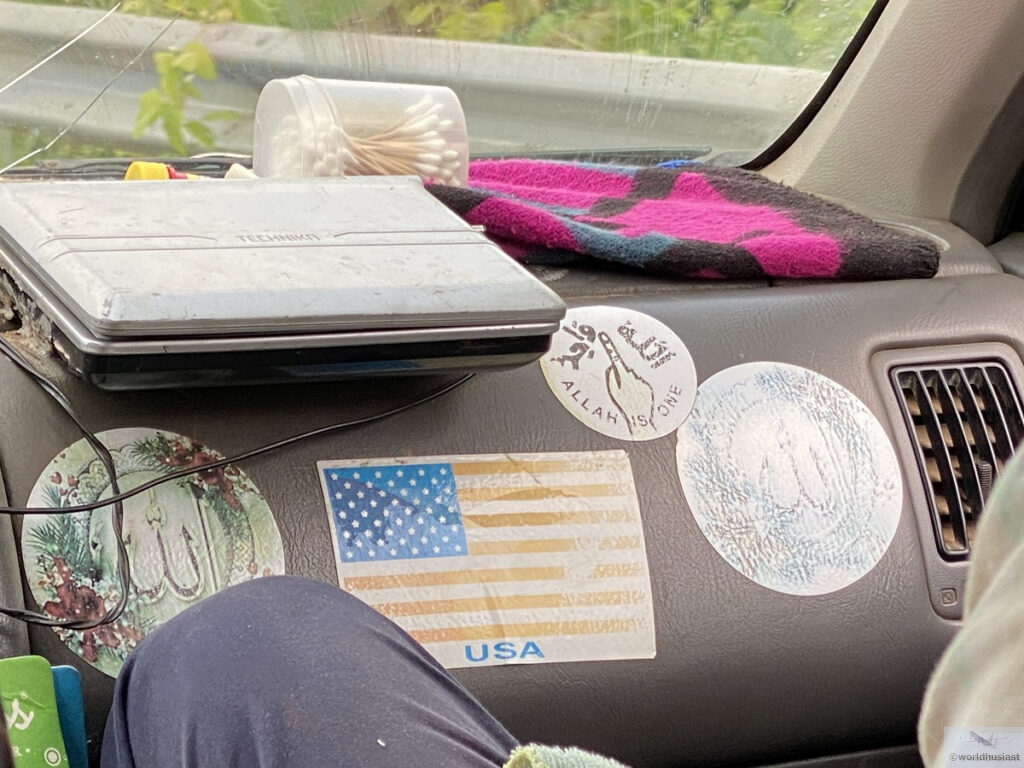 車内にはアラー(イスラム教の神)とアメリカ国旗のシールが貼ってありました。またクーラーなしで、自然の風を取り込むスタイルでした。