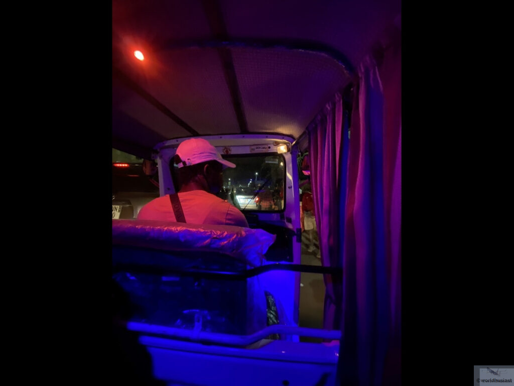15:55に出発しました。助手席に2人、後部は4人掛けに詰めて座り、合計14人ほど乗っていました。長時間の乗車で腰が痛くなりました。途中の検問はすべてドライバーが対応。道路は終始良好でした。トイレ休憩なしでどんどん進んでいきます。