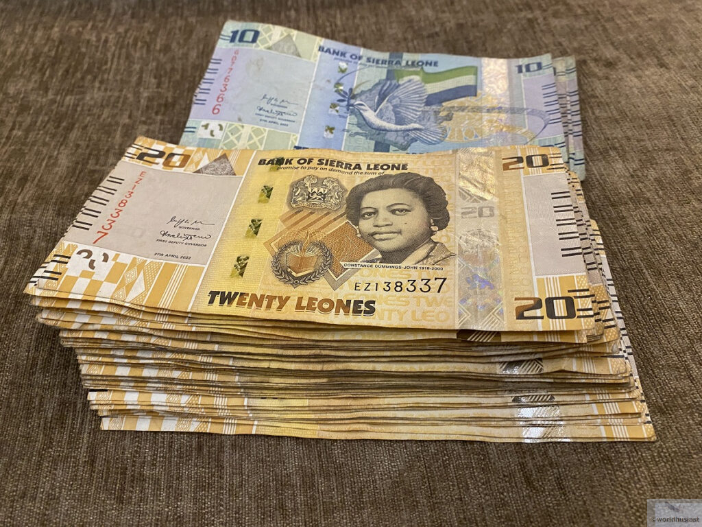 手続の後一本道をしばらく歩いた先に町があり、路上で両替を行いました。余った590リベリア・ドルは65レオン(シエラレオネの通貨)、60米ドルは1,380レオンになりました。20レオン札(約150円)が額面最高なので、ちょっと両替するとこのように札束になります。
